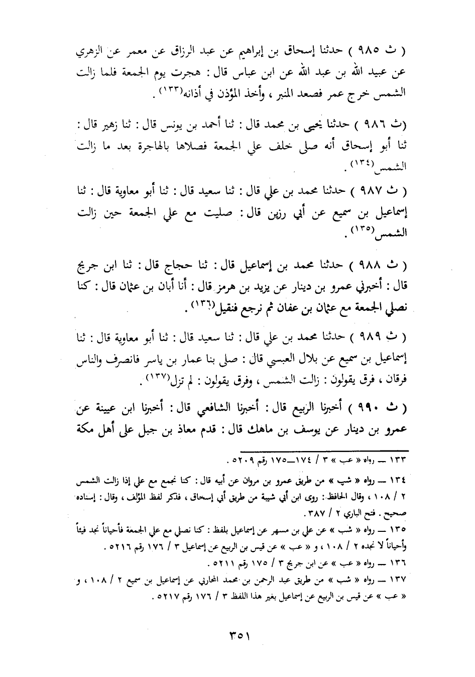 988 - حَدَّثَنَا مُحَمَّدُ بْنُ إِسْمَاعِيلَ، قَالَ: ثنا حَجَّاجٌ، قَالَ: ثنا ابْنُ جُرَيْجٍ، قَالَ: أَخْبَرَنِي عَمْرُو بْنُ دِينَارٍ، عَنْ يَزِيدَ بْنِ هُرْمُزَ، قَالَ: أنا أَبَانُ بْنُ عُثْمَانَ قَالَ: كُنَّا نُصَلِّي الْجُمُعَةَ مَعَ عُثْمَانَ بْنِ عَفَّانَ ثُمَّ نَرْجِعُ فَنَقِيلُ