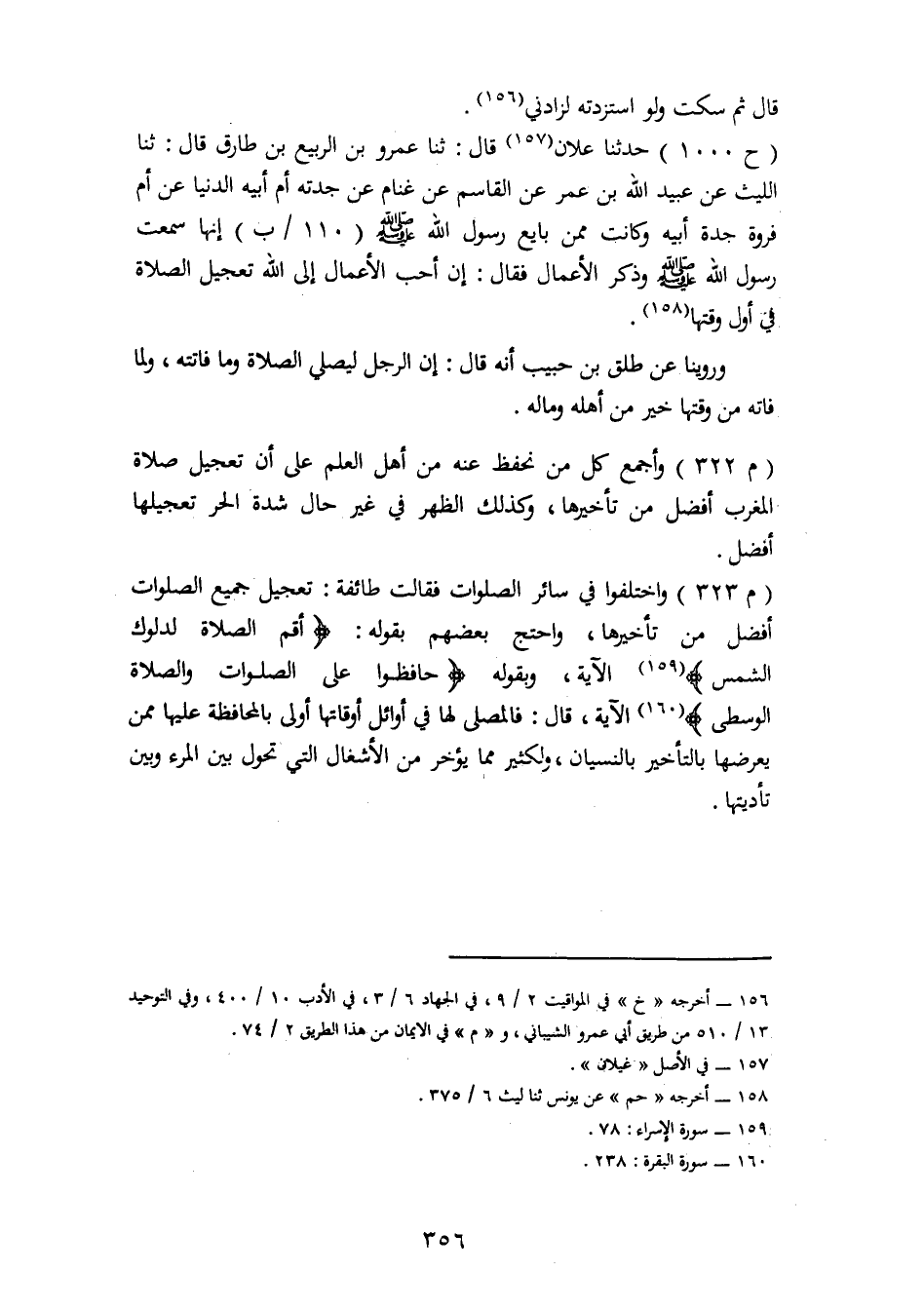 1000 - حَدَّثَنَا عَلَّانٌ، قَالَ: ثنا عَمْرُو بْنُ الرَّبِيعِ بْنِ طَارِقٍ، قَالَ: ثنا اللَّيْثُ، عَنْ عُبَيْدِ اللهِ بْنِ عُمَرَ، عَنِ الْقَاسِمِ، عَنْ غَنَّامٍ، عَنْ جَدَّتِهِ أُمِّ أَبِيهِ الدُّنْيَا، عَنْ أُمِّ فَرْوَةَ، جَدَّةِ أَبِيهِ , وَكَانَتْ مِمَّنْ بَايَعَ رَسُولَ اللهِ صَلَّى اللَّهُ عَلَيْهِ وَسَلَّمَ أَنَّهَا سَمِعَتْ رَسُولَ اللهِ صَلَّى اللَّهُ عَلَيْهِ وَسَلَّمَ وَذَكَرَ الْأَعْمَالَ , فَقَالَ: «إِنَّ أَحَبَّ الْأَعْمَالِ إِلَى اللهِ تَعْجِيلُ الصَّلَاةِ فِي أَوَّلِ وَقْتِهَا» وَرُوِّينَا عَنْ طَلْقِ بْنِ حَبِيبٍ أَنَّهُ قَالَ: إِنَّ الرَّجُلَ لَيُصَلِّي الصَّلَاةَ , وَمَا فَاتَتْهُ , وَلَمَا فَاتَهُ مِنْ وَقْتِهَا خَيْرٌ مِنْ أَهْلِهِ وَمَالِهِ. وَأَجْمَعَ كُلُّ مَنْ نَحْفَظُ عَنْهُ مِنْ أَهْلِ الْعِلْمِ عَلَى أَنَّ تَعْجِيلَ صَلَاةِ الْمَغْرِبِ أَفْضَلُ مِنْ تَأْخِيرِهَا , وَكَذَلِكَ الظُّهْرِ فِي غَيْرِ حَالِ شِدَّةِ الْحَرِّ تَعْجِيلُهَا أَفْضَلُ وَاخْتَلَفُوا فِي سَائِرِ الصَّلَوَاتِ , فَقَالَتْ طَائِفَةٌ: تَعْجِيلُ جَمِيعِ الصَّلَوَاتِ أَفْضَلُ مِنْ تَأْخِيرِهَا , وَاحْتَجَّ بَعْضُهُمْ بِقَوْلِهِ: {أَقِمِ الصَّلَاةَ لِدُلُوكِ الشَّمْسِ} [الإسراء: 78] الْآيَةِ , وَبِقَوْلِهِ: {حَافِظُوا عَلَى الصَّلَوَاتِ وَالصَّلَاةِ الْوُسْطَى} [البقرة: 238] الْآيَةِ. قَالَ: فَالْمُصَلَّى لَهَا فِي أَوَائِلِ أَوْقَاتِهَا أَوْلَى بِالْمُحَافَظَةِ عَلَيْهَا مِمَّنْ يُعَرِّضُهَا بِالتَّأْخِيرِ بِالنِّسْيَانِ , وَلَكَثِيرُ مِمَّا يُؤَخِّرُ مِنَ الْأَشْغَالِ الَّتِي تَحَوَّلُ بَيْنَ الْمَرْءِ وَبَيْنَ تَأْدِيَتِهَا , -[357]- وَاحْتَجَّ بَعْضُهُمْ بِالْحَدِيثِ الَّذِي جَاءَ عَنْ رَسُولِ اللهِ صَلَّى اللَّهُ عَلَيْهِ وَسَلَّمَ أَنَّهُ قَالَ: «إِنَّ أَحَبَّ الْأَعْمَالِ إِلَى اللهِ تَعْجِيلُ الصَّلَاةِ فِي أَوَّلِ وَقْتِهَا» . يَعُمُّ الصَّلَوَاتِ وَلَمْ يُخَصِّصْ. قَالَ: وَلَمَّا أَجْمَعُوا عَلَى أَنْ تَعْجِيلَ صَلَاةِ الْمَغْرِبِ أَفْضَلُ كَانَ حُكْمُ سَائِرِ الصَّلَوَاتِ حُكْمَ صَلَاةِ الْمَغْرِبِ الْمُجْمَعِ عَلَى أَنَّ تَعْجِيلَهَا أَفْضَلُ , وَاحْتَجَّ آخِرُ بِحَدِيثِ الْمُغِيرَةِ بْنِ شُعْبَةَ الَّذِي فِيهِ ذَكَرَ صَلَاةَ النَّبِيِّ صَلَّى اللَّهُ عَلَيْهِ وَسَلَّمَ خَلْفَ عَبْدِ الرَّحْمَنِ بْنِ عَوْفٍ. قَالَ: فَلَمَّا قَضَى النَّبِيُّ صَلَّى اللَّهُ عَلَيْهِ وَسَلَّمَ صَلَاتَهُ أَقْبَلَ عَلَيْهِمْ , ثُمَّ قَالَ: «أَحْسَنْتُمْ أَوْ أَصَبْتُمْ» ؛ يَغْبِطُهُمْ أَنْ صَلُّوا الصَّلَاةَ لِوَقْتِهَا. قَالَ: أَفَلَا تَرَاهُ حَسَنٌ لَهُمْ تَعْجِيلُهُمُ الصَّلَاةَ وَتَرْكَهُمُ انْتِظَارَهُ حَتَّى غَبَطَهُمْ بِهِ يُرَغِّبُهُمْ بِذَلِكَ فِي تَعْجِيلِ الصَّلَاةِ فِي أَوَّلِ الْوَقْتِ