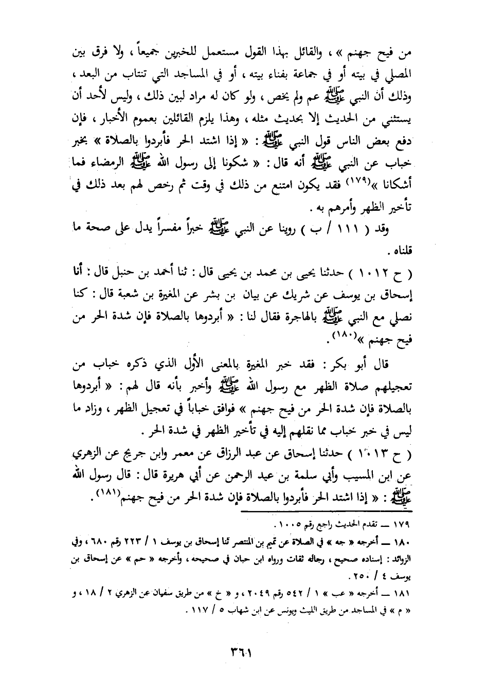 1013 - حَدَّثَنَا إِسْحَاقُ، عَنْ عَبْدِ الرَّزَّاقِ، عَنْ مَعْمَرٍ، وَابْنِ جُرَيْجٍ عَنِ الزُّهْرِيِّ، عَنِ ابْنِ الْمُسَيِّبِ، وَأَبِي سَلَمَةَ بْنِ عَبْدِ الرَّحْمَنِ عَنْ أَبِي هُرَيْرَةَ، قَالَ: قَالَ رَسُولُ اللهِ صَلَّى اللَّهُ عَلَيْهِ وَسَلَّمَ: «إِذَا اشْتَدَّ الْحَرُّ فَأَبْرِدُوا بِالصَّلَاةِ فَإِنَّ شِدَّةَ الْحَرِّ مِنْ فَيْحِ جَهَنَّمَ» -[362]-