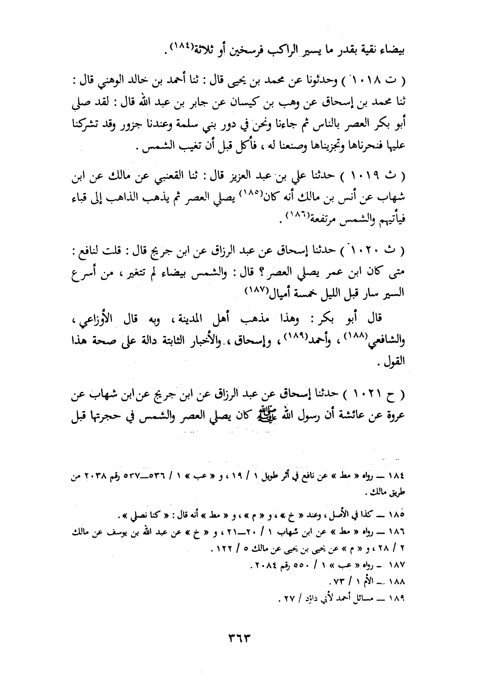 1020 - حَدَّثَنَا إِسْحَاقُ، عَنْ عَبْدِ الرَّزَّاقِ، عَنِ ابْنِ جُرَيْجٍ، قَالَ: " قُلْتُ لِنَافِعٍ: مَتَى كَانَ ابْنُ عُمَرَ يُصَلِّي الْعَصْرَ؟ قَالَ: وَالشَّمْسُ بَيْضَاءُ لَمْ تَتَغَيَّرْ مَنْ أَسْرَعَ السَّيْرَ سَارَ قَبْلَ اللَّيْلِ خَمْسَةَ أَمْيَالٍ " قَالَ أَبُو بَكْرٍ: وَهَذَا مَذْهَبُ أَهْلِ الْمَدِينَةِ وَبِهِ قَالَ الْأَوْزَاعِيُّ وَالشَّافِعِيُّ وَأَحْمَدُ وَإِسْحَاقُ وَالْأَخْبَارُ الثَّابِتَةُ دَالَّةٌ عَلَى صِحَّةِ هَذَا الْقَوْلِ