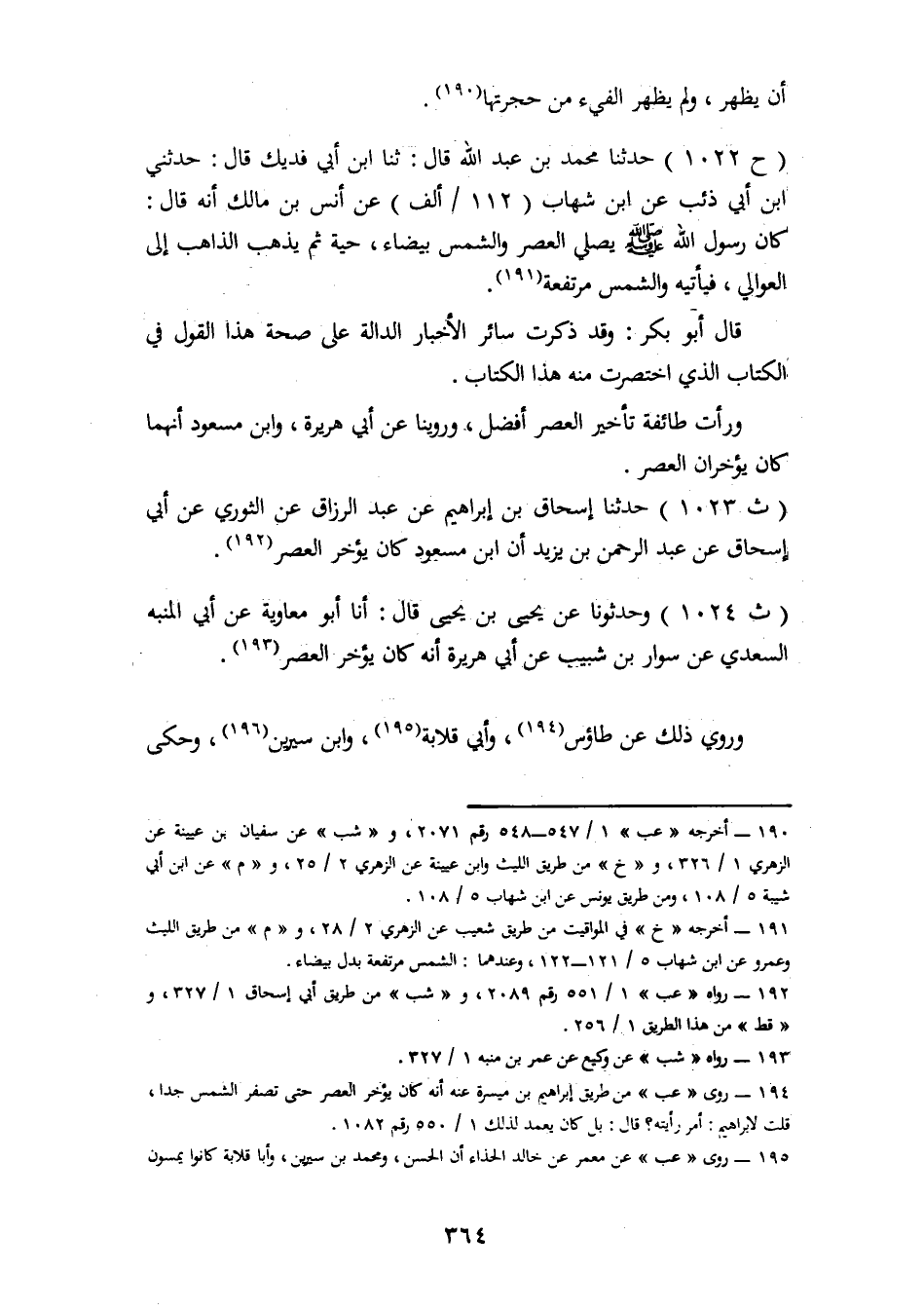 1022 - حَدَّثَنَا مُحَمَّدُ بْنُ عَبْدِ اللهِ، قَالَ: ثنا ابْنُ أَبِي فُدَيْكٍ، قَالَ: حَدَّثَنِي ابْنُ أَبِي ذِئْبٍ، عَنِ ابْنِ شِهَابٍ، عَنْ أَنَسِ بْنِ مَالِكٍ، أَنَّهُ قَالَ: «كَانَ رَسُولُ اللهِ صَلَّى اللَّهُ عَلَيْهِ وَسَلَّمَ يُصَلِّي الْعَصْرَ وَالشَّمْسُ بَيْضَاءُ حَيَّةٌ ثُمَّ يَذْهَبُ الذَّاهِبُ إِلَى الْعَوَالِي فَيَأْتِيهِ وَالشَّمْسُ مُرْتَفِعَةٌ» قَالَ أَبُو بَكْرٍ: وَقَدْ ذَكَرْتُ سَائِرَ الْأَخْبَارِ الدَّالَّةِ عَلَى صِحَّةِ هَذَا الْقَوْلِ فِي الْكِتَابِ الَّذِي اخْتَصَرْتُ مِنْهُ هَذَا الْكِتَابَ. وَرَأَتْ طَائِفَةٌ تَأْخِيرَ الْعَصْرِ أَفْضَلُ وَرُوِّينَا عَنْ أَبِي هُرَيْرَةَ وَابْنِ مَسْعُودٍ أَنَّهُمَا كَانَ يُؤَخَّرَانِ الْعَصْرَ