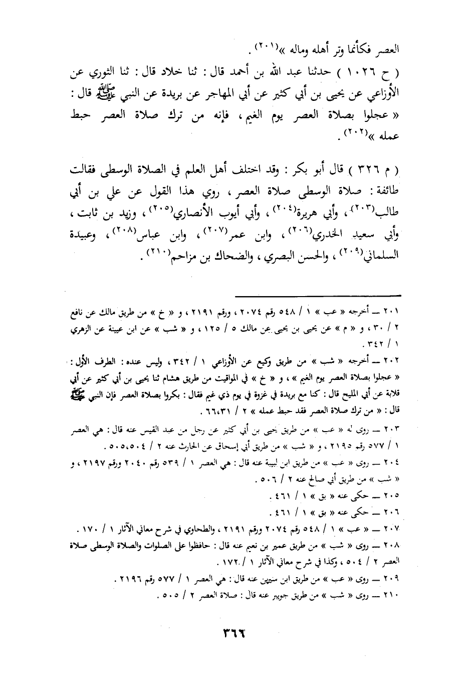 1026 - حَدَّثَنَا عَبْدُ اللهِ بْنُ أَحْمَدَ، قَالَ: ثنا خَلَّادٌ، قَالَ: ثنا الثَّوْرِيُّ، عَنِ الْأَوْزَاعِيِّ، عَنْ يَحْيَى بْنِ أَبِي كَثِيرٍ، عَنْ أَبِي الْمُهَاجِرِ، عَنْ بُرَيْدَةَ، عَنِ النَّبِيِّ صَلَّى اللَّهُ عَلَيْهِ وَسَلَّمَ قَالَ: «عَجِّلُوا بِصَلَاةِ الْعَصْرُ يَوْمُ الْغَيْمِ فَإِنَّهُ مَنْ تَرَكَ صَلَاةَ الْعَصْرِ حَبِطَ عَمَلُهُ» قَالَ أَبُو بَكْرٍ: وَقَدِ اخْتَلَفَ أَهْلُ الْعِلْمِ فِي الصَّلَاةِ الْوُسْطَى فَقَالَتْ طَائِفَةٌ: صَلَاةُ الْوُسْطَى صَلَاةُ الْعَصْرِ رُوِيَ هَذَا الْقَوْلُ عَنْ عَلِيِّ بْنِ أَبِي طَالِبٍ وَأَبِي هُرَيْرَةَ وَأَبِي أَيُّوبَ الْأَنْصَارِيِّ وَزَيْدِ بْنِ ثَابِتٍ وَأَبِي سَعِيدٍ الْخُدْرِيِّ وَابْنِ عُمَرَ وَابْنِ عَبَّاسٍ وَعُبَيْدَةَ السَّلْمَانِيِّ وَالْحَسَنِ الْبَصْرِيِّ وَالضَّحَّاكِ بْنِ مُزَاحِمٍ. -[367]- وَفِيهِ قَوْلٌ ثَانٍ وَهُوَ أَنَّ الصَّلَاةَ الْوُسْطَى صَلَاةُ الظُّهْرِ رُوِيَ هَذَا الْقَوْلُ عَنِ ابْنِ عُمَرَ وَعَائِشَةَ وَعَبْدِ اللهِ بْنِ شَدَّادٍ. وَفِيهِ قَوْلٌ ثَالِثٌ: وَهُوَ أَنَّهَا الصُّبْحُ وَرُوِّينَا ذَلِكَ عَنِ ابْنِ عُمَرَ وَابْنِ عَبَّاسٍ وَعِكْرِمَةَ وَطَاوُسٍ وَعَبْدِ اللهِ بْنِ شَدَّادٍ وَعَطَاءٍ وَمُجَاهِدٍ وَدَلَّتِ الْأَخْبَارُ الثَّابِتَةُ عَلَى أَنَّ الصَّلَاةَ الْوُسْطَى صَلَاةُ الْعَصْرِ