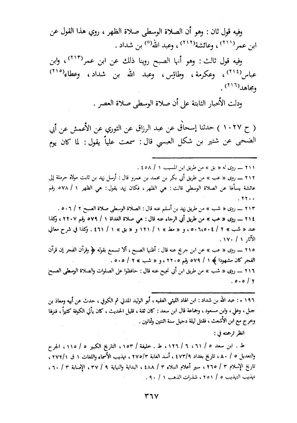 1027 - حَدَّثَنَا إِسْحَاقُ، عَنْ عَبْدِ الرَّزَّاقِ، عَنِ الثَّوْرِيِّ، عَنِ الْأَعْمَشِ، عَنْ أَبِي الضُّحَى، عَنْ شُتَيْرِ بْنِ شَكْلٍ الْعَبْسِيِّ، قَالَ: سَمِعْتُ عَلِيًّا، يَقُولُ: لَمَّا كَانَ يَوْمُ -[368]- الْأَحْزَابِ صَلَّيْنَا الْعَصْرَ بَيْنَ الْمَغْرِبِ وَالْعِشَاءِ فَقَالَ النَّبِيُّ صَلَّى اللَّهُ عَلَيْهِ وَسَلَّمَ: «شَغَلُونَا عَنِ الصَّلَاةِ الْوُسْطَى صَلَاةَ الْعَصْرِ مَلَأَ اللهُ قُبُورَهُمْ وَأَجْوَافَهُمْ نَارًا»