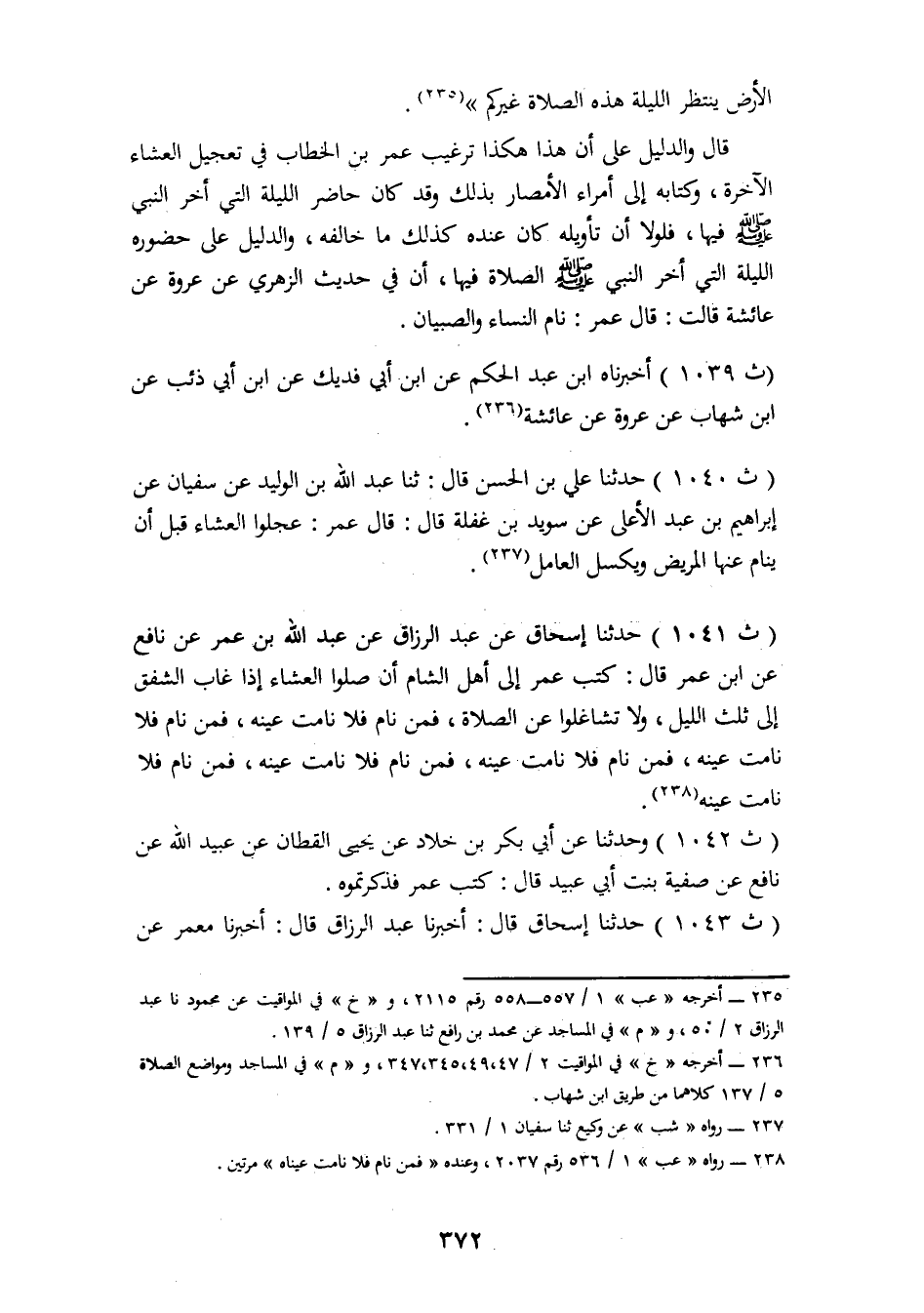 1041 - حَدَّثَنَا إِسْحَاقُ، عَنْ عَبْدِ الرَّزَّاقِ، عَنْ عَبْدِ اللهِ بْنِ عُمَرَ، عَنْ نَافِعٍ، عَنِ ابْنِ عُمَرَ، قَالَ: كَتَبَ عُمَرُ إِلَى أَهْلِ الشَّامِ «أَنْ صَلُّوا الْعِشَاءَ إِذَا غَابَ الشَّفَقُ إِلَى ثُلُثِ اللَّيْلِ وَلَا تَشَاغَلُوا عَنِ الصَّلَاةِ، فَمَنْ نَامَ فَلَا نَامَتْ عَيْنُهُ فَمَنْ نَامَ فَلَا نَامَتْ عَيْنُهُ فَمَنْ نَامَ فَلَا نَامَتْ عَيْنُهُ فَمَنْ نَامَ فَلَا نَامَتْ عَيْنُهُ فَمَنْ نَامَ فَلَا نَامَتْ عَيْنُهُ» .