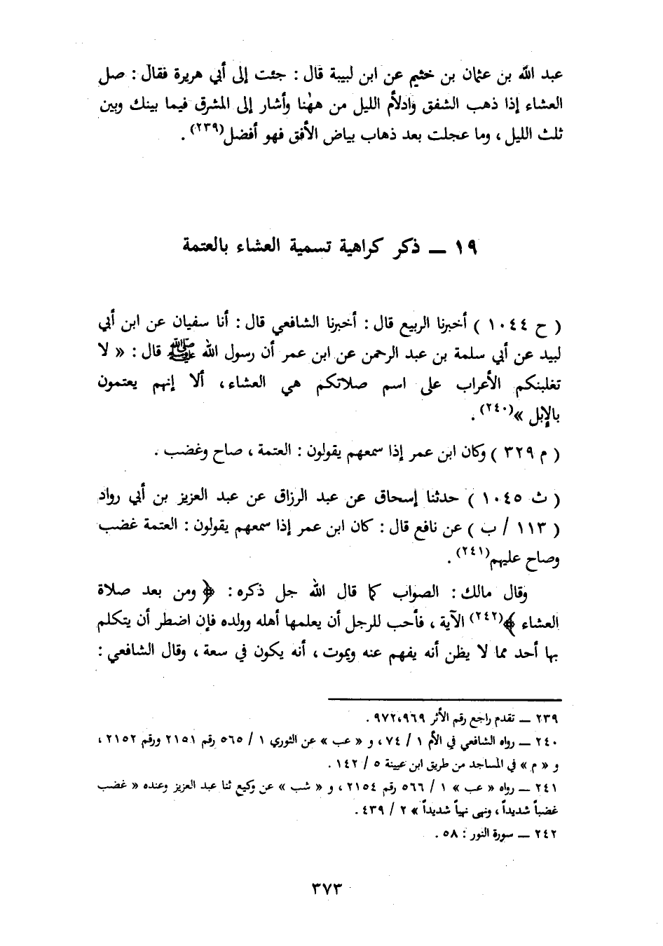 1045 - حَدَّثَنَا إِسْحَاقُ، عَنْ عَبْدِ الرَّزَّاقِ، عَنْ عَبْدِ الْعَزِيزِ بْنِ أَبِي رَوَّادٍ، عَنْ نَافِعٍ، قَالَ: «كَانَ ابْنُ عُمَرَ إِذَا سَمِعَهُمْ يَقُولُونَ الْعَتَمَةُ، غَضِبَ وَصَاحَ عَلَيْهِمْ» وَقَالَ مَالِكٌ: الصَّوَابُ كَمَا قَالَ اللهُ جَلَّ ذِكْرُهُ {وَمِنْ بَعْدِ صَلَاةِ الْعِشَاءِ} [النور: 58] الْآيَةَ فَأُحِبُّ لِلرَّجُلِ أَنْ يُعَلِّمَهَا أَهْلَهُ وَوَلَدَهُ فَإِنِ اضْطُرَّ أَنْ يَتَكَلَّمَ بِهَا أَحَدٌ مِمَّا لَا يُظَنُّ أَنَّهُ يُفْهَمُ عَنْهُ وَيَمُوتُ أَنَّهُ يَكُونُ فِي سَعَةٍ، وَقَالَ الشَّافِعِيُّ: -[374]- أَحَبُّ إِلَيَّ أَنْ لَا تُسَمَّى إِلَّا الْعِشَاءُ كَمَا سَمَّاهَا رَسُولُ اللهِ صَلَّى اللَّهُ عَلَيْهِ وَسَلَّمَ، قَالَ أَبُو بَكْرٍ: وَكَذَلِكَ يَجِبُ أَنْ تُسَمَّى فَإِنْ سَمَّاهَا مُسَمَّى الْعَتَمَةِ لَمْ يُحْرِجَ لِأَنَّا قَدْ رُوِّينَا عَنِ النَّبِيِّ صَلَّى اللَّهُ عَلَيْهِ وَسَلَّمَ بِالْإِسْنَادِ الثَّابِتِ أَنَّهُ سَمَّاهَا الْعَتَمَةَ إِنْ صَحَّتْ هَذِهِ اللَّفْظَةُ