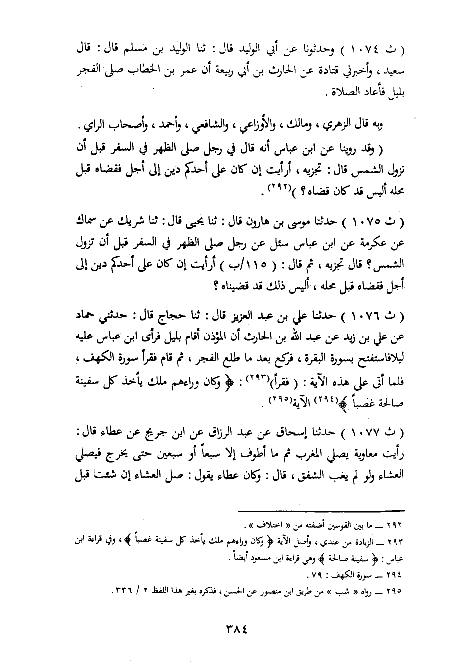 1076 - حَدَّثَنَا عَلِيُّ بْنُ عَبْدِ الْعَزِيزِ، قَالَ: ثنا حَجَّاجٌ، قَالَ: حَدَّثَنِي حَمَّادٌ، عَنْ عَلِيِّ بْنِ زَيْدٍ، عَنْ عَبْدِ اللهِ بْنِ الْحَارِثِ، أَنَّ الْمُؤَذِّنَ، أَقَامَ بِلَيْلٍ , فَرَأَى ابْنَ عَبَّاسٍ عَلَيْهِ لَيْلًا , فَاسْتَفْتَحَ بِسُورَةِ الْبَقَرَةِ , فَرَكَعَ بَعْدَ مَا طَلَعَ الْفَجْرَ , ثُمَّ قَامَ , فَقَرَأَ سُورَةَ الْكَهْفِ , فَلَمَّا أَتَى عَلَى هَذِهِ الْآيَةِ , فَقَرَأَ {وَكَانَ وَرَاءَهُمْ مَّلِكٌ يَأْخُذُ كُلَّ سَفِينَةٍ غَصْبًا} [الكهف: 79] الْآيَةَ