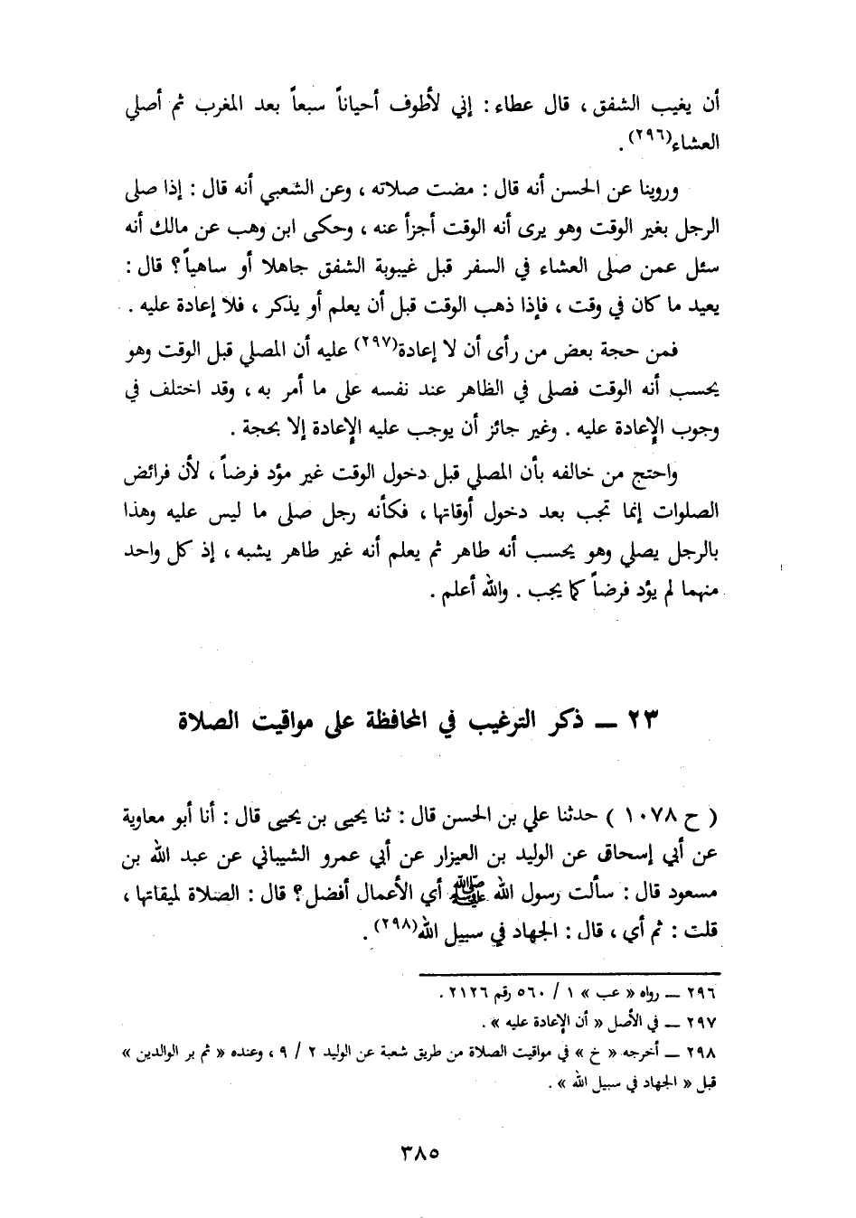 1078 - حَدَّثَنَا عَلِيُّ بْنُ الْحَسَنِ، قَالَ: ثنا يَحْيَى بْنُ يَحْيَى، قَالَ: أنا أَبُو مُعَاوِيَةَ، عَنْ أَبِي إِسْحَاقَ، عَنِ الْوَلِيدِ بْنِ الْعَيْزَارِ، عَنْ أَبِي عَمْرٍو الشَّيْبَانِيِّ، عَنْ عَبْدِ اللهِ بْنِ مَسْعُودٍ، قَالَ: سَأَلْتُ رَسُولَ اللهِ صَلَّى اللَّهُ عَلَيْهِ وَسَلَّمَ أَيُّ الْأَعْمَالِ أَفْضَلُ؟ قَالَ: " الصَّلَاةُ لِمِيقَاتِهَا، قُلْتُ ثُمَّ أَيُّ؟ قَالَ: الْجِهَادُ فِي سَبِيلِ اللهِ " -[386]- وَرُوِّينَا عَنْ عَبْدِ اللهِ بْنِ مَسْعُودٍ، أَنَّهُ قِيلَ لَهُ إِنَّ اللهَ جَلَّ ذِكْرُهُ يُكْثِرُ ذِكْرَ الصَّلَاةِ فِي الْقُرْآنِ {الَّذِينَ هُمْ عَلَى صَلَاتِهِمْ دَائِمُونَ} [المعارج: 23] {وَالَّذِينَ هُمْ عَلَى صَلَاتِهِمْ يُحَافِظُونَ} [المعارج: 34] فَقَالَ عَبْدُ اللهِ: ذَلِكَ عَلَى مَوَاقِيتِهَا