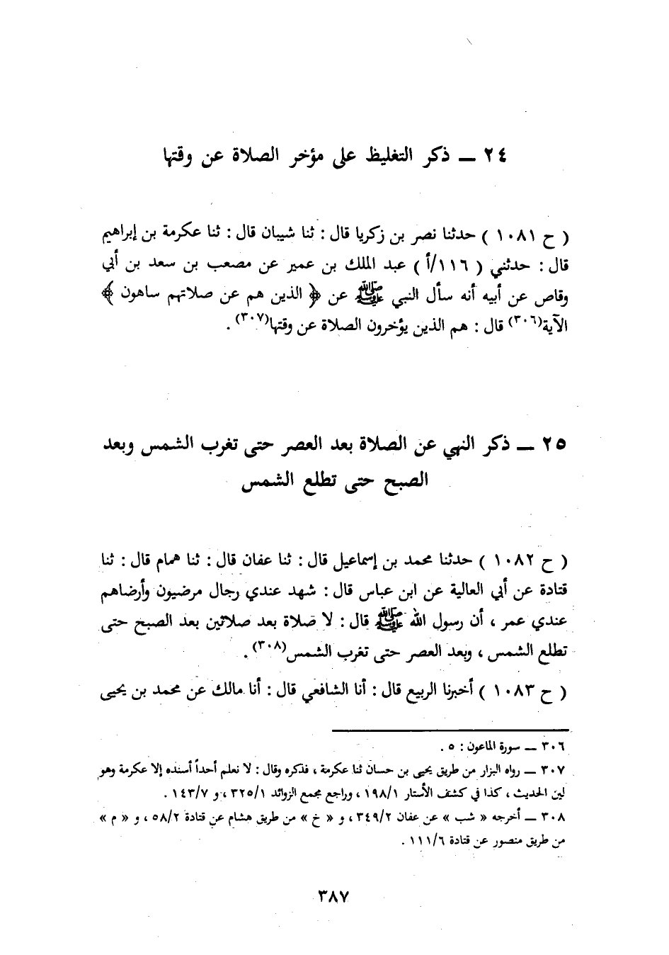 1081 - حَدَّثَنَا نَصْرُ بْنُ زَكَرِيَّا، قَالَ: ثنا شَيْبَانُ، قَالَ: ثنا عِكْرِمَةُ بْنُ إِبْرَاهِيمَ، قَالَ: حَدَّثَنِي عَبْدُ الْمَلِكِ بْنِ عُمَيْرٍ، عَنْ مُصْعَبِ بْنِ سَعْدِ بْنِ أَبِي وَقَّاصٍ، عَنْ أَبِيهِ، أَنَّهُ سَأَلَ النَّبِيَّ صَلَّى اللَّهُ عَلَيْهِ وَسَلَّمَ عَنِ {الَّذِينَ هُمْ عَنْ صَلَاتِهِمْ سَاهُونَ} [الماعون: 5] الْآيَةِ. قَالَ: «هُمُ الَّذِينَ يُؤَخِّرُونَ الصَّلَاةَ عَنْ وَقْتِهَا»