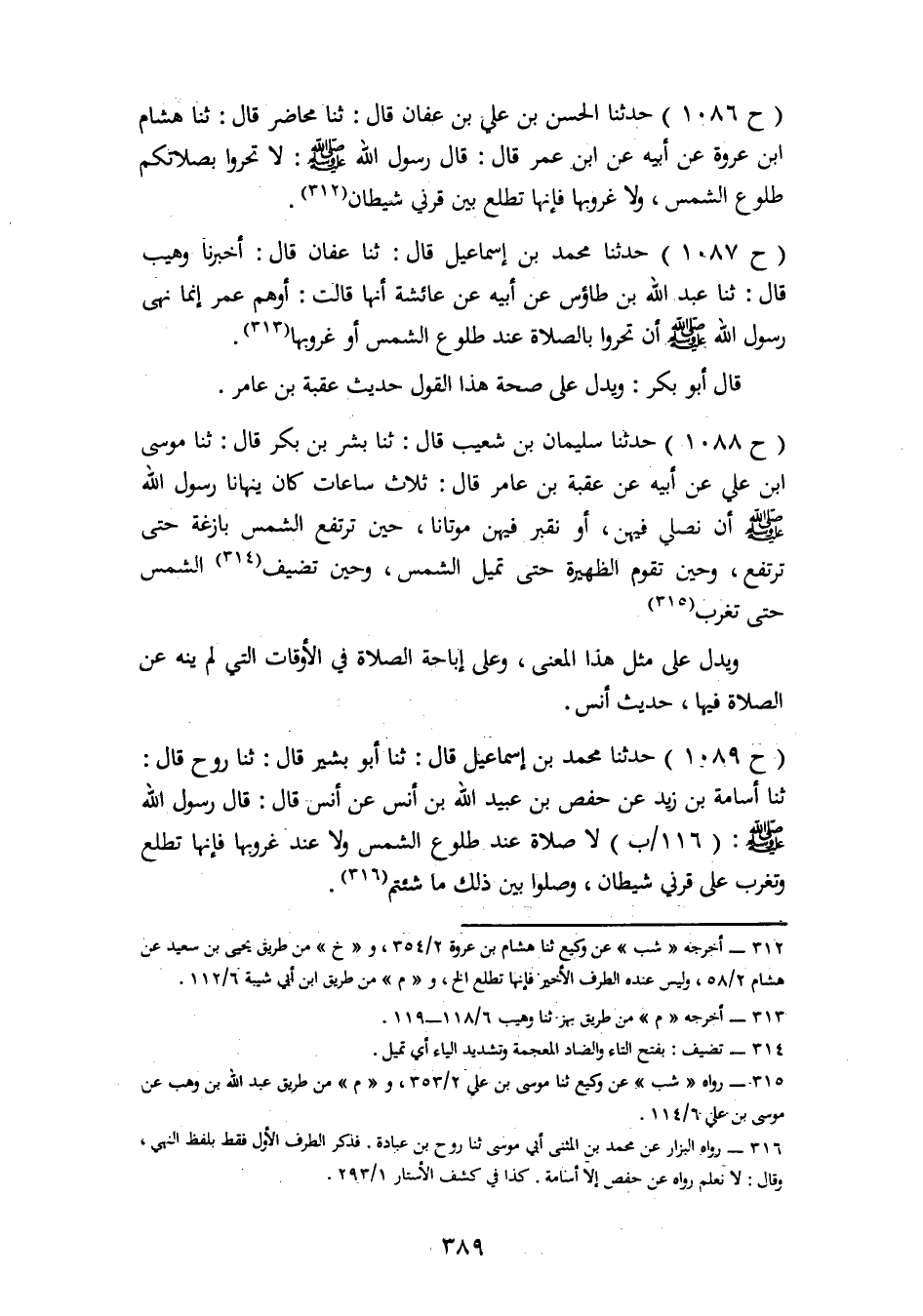 1087 - حَدَّثَنَا مُحَمَّدُ بْنُ إِسْمَاعِيلَ، قَالَ: ثنا عَفَّانُ، قَالَ: أَخْبَرَنَا وُهَيْبٌ، قَالَ: ثنا عَبْدُ اللهِ بْنُ طَاوُسٍ، عَنْ أَبِيهِ، عَنْ عَائِشَةَ، أَنَّهَا قَالَتْ: أوَهِمَ عُمَرُ: «إِنَّمَا نَهَى رَسُولُ اللهِ صَلَّى اللَّهُ عَلَيْهِ وَسَلَّمَ أَنْ تَحَرَّوْا بِالصَّلَاةِ عِنْدَ طُلُوعِ الشَّمْسِ أَوْ غُرُوبِهَا» قَالَ أَبُو بَكْرٍ: وَيَدُلُّ عَلَى صِحَّةِ هَذَا الْقَوْلِ حَدِيثُ عُقْبَةَ بْنِ عَامِرٍ