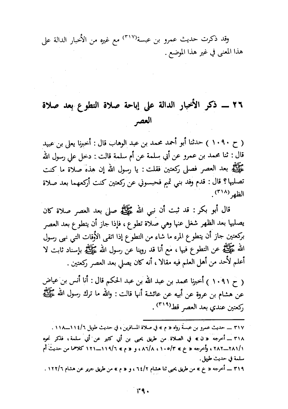 1090 - حَدَّثَنَا أَبُو أَحْمَدَ مُحَمَّدُ بْنُ عَبْدِ الْوَهَّابِ قَالَ: أَخْبَرَنَا يَعْلَى بْنُ عُبَيْدٍ، قَالَ: ثنا مُحَمَّدُ بْنُ عَمْرٍو، عَنْ أَبِي سَلَمَةَ، عَنْ أُمِّ سَلَمَةَ، قَالَتْ: دَخَلَ عَلَيَّ رَسُولُ اللهِ صَلَّى اللَّهُ عَلَيْهِ وَسَلَّمَ بَعْدَ الْعَصْرِ , فَصَلَّى رَكْعَتَيْنِ , فَقُلْتُ: يَا رَسُولَ اللهِ , إِنَّ هَذِهِ صَلَاةً مَا كُنْتَ تُصَلِّيهَا. قَالَ: «قَدِمَ وَفْدُ بَنِي تَمِيمٍ , فَحَبَسُونِي عَنْ رَكْعَتَيْنِ كُنْتُ أَرْكَعُهُمَا بَعْدَ صَلَاةِ الظُّهْرِ» قَالَ أَبُو بَكْرٍ: قَدْ ثَبَتَ أَنَّ نَبِيَّ اللهِ صَلَّى اللَّهُ عَلَيْهِ وَسَلَّمَ صَلَّى بَعْدَ الْعَصْرِ صَلَاةً كَانَ يُصَلِّيهَا بَعْدَ الظُّهْرِ , شُغِلَ عَنْهَا , وَهِيَ صَلَاةُ تَطَوَّعٍ , فَإِذَا جَازَ أَنْ يَتَطَوَّعَ بَعْدَ الْعَصْرِ بِرَكْعَتَيْنِ جَازَ أَنْ يَتَطَوَّعَ الْمَرْءُ مَا شَاءَ مِنَ التَّطَوُّعِ إِذَا اتَّقَى الْأَوْقَاتِ الَّتِي نَهَى رَسُولُ اللهِ صَلَّى اللَّهُ عَلَيْهِ وَسَلَّمَ عَنِ التَّطَوُّعِ فِيهَا مَعَ أَنَّا قَدْ رُوِّينَا عَنْ رَسُولِ اللهِ صَلَّى اللَّهُ عَلَيْهِ وَسَلَّمَ بِإِسْنَادٍ ثَابِتٍ لَا أَعْلَمُ لِأَحَدٍ مِنْ أَهْلِ الْعِلْمِ فِيهِ مَقَالًا أَنَّهُ كَانَ يُصَلِّي بَعْدَ الْعَصْرِ رَكْعَتَيْنِ