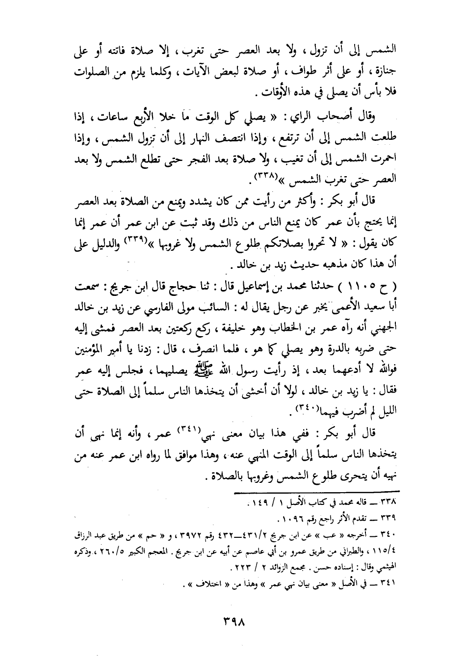 1105 - حَدَّثَنَا مُحَمَّدُ بْنُ إِسْمَاعِيلَ، قَالَ: ثنا حَجَّاجٌ، قَالَ ابْنُ جُرَيْجٍ: سَمِعْتُ أَبَا سَعِيدٍ الْأَعْمَى، يُخْبِرُ عَنْ رَجُلٍ، يُقَالُ لَهُ السَّائِبُ مَوْلَى الْفَارِسِيِّ عَنْ زَيْدِ بْنِ خَالِدٍ الْجُهَنِيِّ، أَنَّهُ رَآهُ عُمَرُ بْنُ الْخَطَّابِ وَهُوَ خَلِيفَةٌ رَكَعَ رَكْعَتَيْنِ بَعْدَ الْعَصْرِ , فَمَشَى إِلَيْهِ حَتَّى ضَرَبَهُ بِالدِّرَّةِ وَهُوَ يُصَلِّي كَمَا هُوَ , فَلَمَّا انْصَرَفَ قَالَ: زِدْنَا يَا أَمِيرَ الْمُؤْمِنِينَ , فَوَاللهِ لَا أَدَعُهُمَا بَعْدُ إِذْ رَأَيْتُ رَسُولَ اللهِ صَلَّى اللَّهُ عَلَيْهِ وَسَلَّمَ يُصَلِّيهِمَا , فَجَلَسَ إِلَيْهِ عُمَرُ , فَقَالَ: «يَا زَيْدُ بْنَ خَالِدٍ , لَوْلَا أَنْ أَخْشَى أَنْ يَتَّخِذَهَا النَّاسُ سُلَّمًا إِلَى الصَّلَاةِ حَتَّى اللَّيْلِ لَمْ أَضْرِبْ فِيهِمَا» . قَالَ أَبُو بَكْرٍ: فَفِي هَذَا بَيَانُ مَعْنَى نَهْيِ عُمَرَ وَأَنَّهُ إِنَّمَا نَهَى أَنْ يَتَّخِذَهَا النَّاسُ سُلَّمًا إِلَى الْوَقْتِ الْمَنْهِيِّ عَنْهُ , وَهَذَا مُوَافِقٌ لِمَا رَوَاهُ ابْنُ عُمَرَ عَنْهُ مِنْ نَهْيِهِ أَنْ يَتَحَرَّى طُلُوعَ الشَّمْسِ وَغُرُوبَهَا بِالصَّلَاةِ