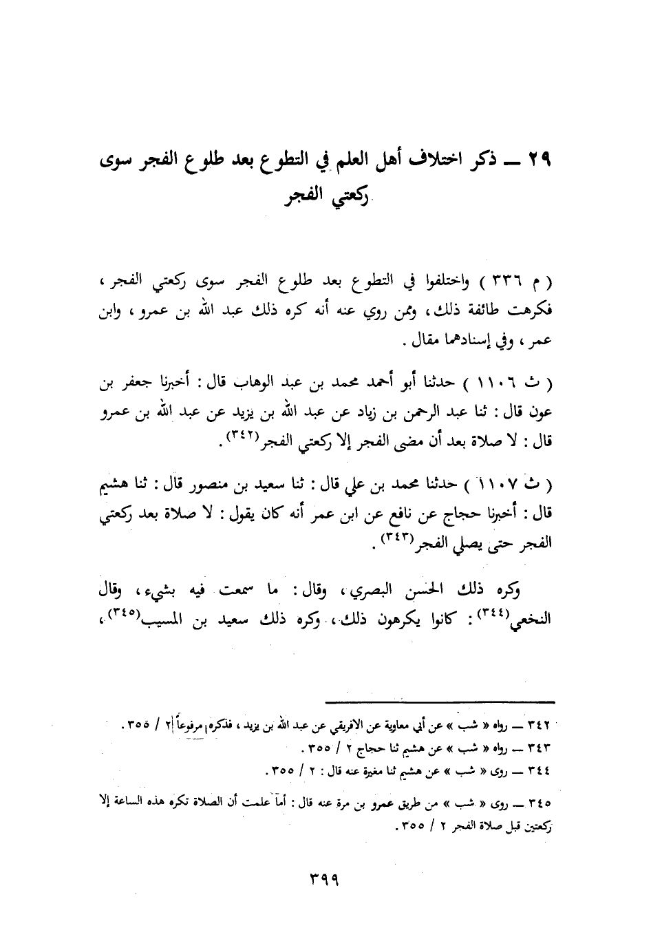 1107 - حَدَّثَنَا مُحَمَّدُ بْنُ عَلِيٍّ، قَالَ: ثنا سَعِيدُ بْنُ مَنْصُورٍ، قَالَ: ثنا هُشَيْمٌ، قَالَ: أَخْبَرَنَا حَجَّاجٌ، عَنْ نَافِعٍ، عَنِ ابْنِ عُمَرَ، أَنَّهُ كَانَ يَقُولُ: «لَا صَلَاةَ بَعْدَ رَكْعَتَيِ الْفَجْرِ حَتَّى يُصَلَّى الْفَجْرُ» وَكَرِهَ ذَلِكَ الْحَسَنُ الْبَصْرِيُّ , وَقَالَ: مَا سَمِعْتُ فِيهِ بِشَيْءٍ , وَقَالَ النَّخَعِيُّ: كَانُوا يَكْرَهُونَ ذَلِكَ. وَكَرِهَ ذَلِكَ سَعِيدُ بْنُ الْمُسَيِّبِ -[400]- وَالْعَلَاءُ بْنُ زِيَادٍ , وَحُمَيْدُ بْنُ عَبْدِ الرَّحْمَنِ وَأَصْحَابُ الرَّأْيِ , وَرَخَّصَتْ طَائِفَةٌ فِي ذَلِكَ , وَمِمَّنْ قَالَ: لَا بَأْسَ بِأَنْ يَتَطَوَّعَ الرَّجُلُ بَعْدَ طُلُوعِ الْفَجْرِ الْحَسَنُ الْبَصْرِيُّ , وَكَانَ مَالِكٌ يَرَى أَنْ يَفْعَلَ ذَلِكَ مَنْ فَاتَتْهُ صَلَاتُهُ بِاللَّيْلِ. وَرُوِّينَا عَنْ بِلَالٍ أَنَّهُ لَمْ يَنْهَ عَنِ الصَّلَاةِ إِلَّا عِنْدَ طُلُوعِ الشَّمْسِ؛ فَإِنَّهَا تَطْلُعُ بَيْنَ قَرْنَيِ الشَّيْطَانِ