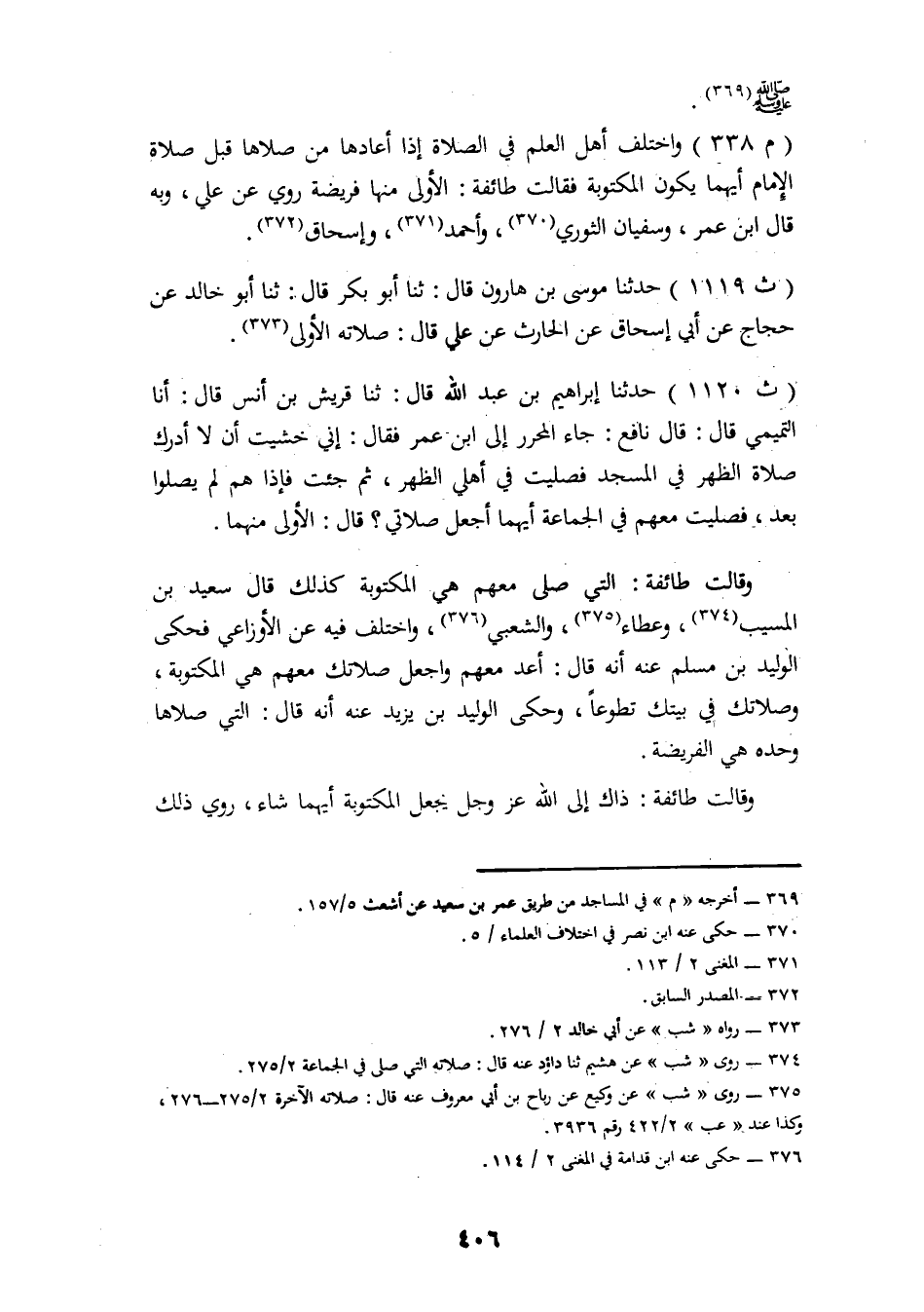 1120 - حَدَّثَنَا إِبْرَاهِيمُ بْنُ عَبْدِ اللهِ، قَالَ: ثنا قُرَيْشُ بْنُ أَنَسٍ، قَالَ: أنا التَّمِيمِيُّ، قَالَ: قَالَ نَافِعٌ جَاءَ الْمُحَرَّرُ إِلَى ابْنِ عُمَرَ فَقَالَ: «إِنِّي خَشِيتُ أَنْ لَا أُدْرِكَ صَلَاةَ الظُّهْرِ فِي الْمَسْجِدِ فَصَلَّيْتُ فِي أَهْلِي الظُّهْرَ ثُمَّ جِئْتُ فَإِذَا هُمْ لَمْ يُصَلُّوا بَعْدُ فَصَلَّيْتُ مَعَهُمْ فِي الْجَمَاعَةِ، أَيَّهُمَا أَجْعَلُ صَلَاتِي؟ قَالَ الْأُولَى مِنْهُمَا» وَقَالَتْ طَائِفَةٌ: الَّتِي صَلَّى مَعَهُمْ هِيَ الْمَكْتُوبَةُ، كَذَلِكَ قَالَ سَعِيدُ بْنُ الْمُسَيِّبِ وَعَطَاءٌ وَالشَّعْبِيُّ وَاخْتُلِفَ فِيهِ عَنِ الْأَوْزَاعِيِّ فَحَكَى الْوَلِيدُ بْنُ مُسْلِمٍ عَنْهُ أَنَّهُ قَالَ: أَعِدْ مَعَهُمْ وَاجْعَلْ صَلَاتَكَ مَعَهُمْ هِيَ الْمَكْتُوبَةُ وَصَلَاتُكَ فِي بَيْتِكَ تَطَوُّعًا، وَحَكَى الْوَلِيدُ بْنُ يَزِيدَ عَنْهُ أَنَّهُ قَالَ: الَّتِي صَلَّاهَا وَحْدَهُ هِيَ الْفَرِيضَةُ، وَقَالَتْ طَائِفَةٌ: ذَاكَ إِلَى اللهِ عَزَّ وَجَلَّ يَجْعَلُ الْمَكْتُوبَةَ أَيَّهُمَا شَاءَ، رُوِيَ ذَلِكَ -[407]- عَنِ ابْنِ عُمَرَ وَسَعِيدِ بْنِ الْمُسَيِّبِ وَعَطَاءٍ خِلَافَ مَا ذَكَرْنَاهُ عَنْهُمْ