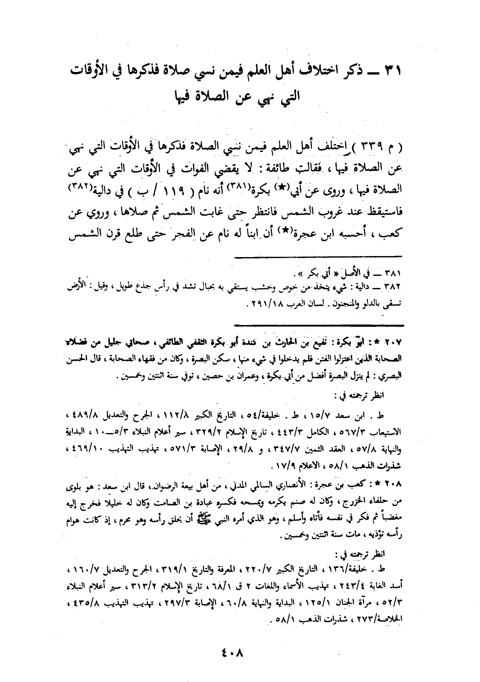 ذِكْرُ اخْتِلَافِ أَهْلِ الْعِلْمِ فِيمَنْ نَسِيَ صَلَاةً فَذَكَرَهَا فِي الْأَوْقَاتِ الَّتِي نُهِيَ عَنِ الصَّلَاةِ فِيهَا اخْتَلَفَ أَهْلُ الْعِلْمِ فِيمَنْ نَسِيَ الصَّلَاةَ فَذَكَرَهَا فِي الْأَوْقَاتِ الَّتِي نُهِيَ عَنِ الصَّلَاةِ فِيهَا، فَقَالَتْ طَائِفَةٌ: لَا يَقْضِي الْفَوَاتَ فِي الْأَوْقَاتِ الَّتِي نُهِيَ عَنِ الصَّلَاةِ فِيهَا وَرُوِيَ عَنْ أَبِي بَكَرَةَ أَنَّهُ نَامَ فِي دَالِيَةٍ فَاسْتَيْقَظَ عِنْدَ غُرُوبِ الشَّمْسِ فَانْتَظَرَ حَتَّى غَابَتِ الشَّمْسُ ثُمَّ صَلَّاهَا، وَرُوِيَ عَنْ كَعْبٍ أَحْسِبُهُ ابْنَ عُجْرَةَ أَنَّ ابْنًا لَهُ نَامَ عَنِ الْفَجْرِ حَتَّى طَلَعَ قَرْنُ الشَّمْسِ -[409]- فَأَجْلَسَهُ إِلَى جَنْبِهِ، فَلَمَّا أَنْ تَعَلَّتِ الشَّمْسُ وَابْيَضَّتْ فَأَتَتِ السَّبَخَةَ قَالَ لَهُ: صَلِّ الْآنَ