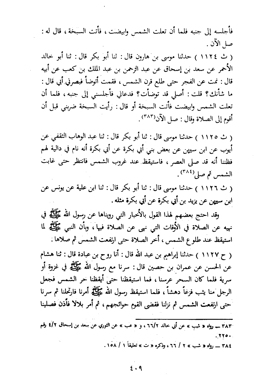 1126 - حَدَّثَنَا مُوسَى، قَالَ: ثنا أَبُو بَكْرٍ، قَالَ ثنا ابْنُ عُلَيَّةَ، عَنْ يُونُسَ، عَنِ ابْنِ سِيرِينَ، عَنْ يَزِيدَ بْنِ أَبِي بَكَرَةَ، عَنْ أَبِي بَكَرَةَ، مِثْلَهُ وَقَدِ احْتَجَّ بَعْضُهُمْ لِهَذَا الْقَوْلِ بِالْأَخْبَارِ الَّتِي رُوِّينَاهَا عَنْ رَسُولِ اللهِ صَلَّى اللَّهُ عَلَيْهِ وَسَلَّمَ فِي نَهْيِهِ عَنِ الصَّلَاةِ فِي الْأَوْقَاتِ الَّتِي نَهَى عَنِ الصَّلَاةِ فِيهَا وَبِأَنَّ النَّبِيَّ صَلَّى اللَّهُ عَلَيْهِ وَسَلَّمَ لَمَّا اسْتَيْقَظَ عِنْدَ طُلُوعِ الشَّمْسِ أَخَّرَ الصَّلَاةَ حَتَّى ارْتَفَعَتِ الشَّمْسُ ثُمَّ صَلَّاهَا