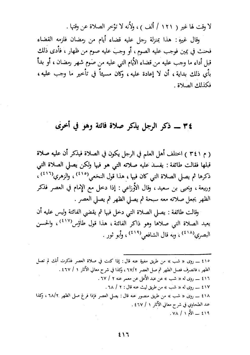ذِكْرُ الرَّجُلِ يَذْكُرُ صَلَاةً فَائِتَةً وَهُوَ فِي أُخْرَى اخْتَلَفَ أَهْلُ الْعِلْمِ فِي الرَّجُلِ يَكُونُ فِي الصَّلَاةِ فَيَذْكُرُ أَنَّ عَلَيْهِ صَلَاةً قَبْلَهَا فَقَالَتْ طَائِفَةٌ: يَفْسُدُ عَلَيْهِ صَلَاتُهُ الَّتِي هُوَ فِيهَا وَلَكِنْ يُصَلِّي الصَّلَاةَ الَّتِي ذَكَرَهَا ثُمَّ يُصَلِّي الصَّلَاةَ الَّتِي كَانَ فِيهَا، هَذَا قَوْلُ النَّخَعِيِّ وَالزُّهْرِيِّ وَرَبِيعَةَ وَيَحْيَى بْنِ سَعِيدٍ، وَقَالَ الْأَوْزَاعِيُّ: إِذَا دَخَلَ مَعَ الْإِمَامِ فِي الْعَصْرِ فَذَكَرَ الظُّهْرَ يَجْعَلُ صَلَاتَهُ مَعَهُ سُبْحَةً ثُمَّ يُصَلِّي الظُّهْرَ ثُمَّ يُصَلِّي الْعَصْرَ، وَقَالَتْ طَائِفَةٌ: يُصَلِّي الصَّلَاةَ الَّتِي دَخَلَ فِيهَا ثُمَّ يَقْضِي الْفَائِتَةَ وَلَيْسَ عَلَيْهِ أَنْ يُعِيدَ الصَّلَاةَ الَّتِي صَلَّاهَا وَهُوَ ذَاكِرٌ الْفَائِتَةَ، هَذَا قَوْلُ طَاوُسٍ وَالْحَسَنِ الْبَصْرِيِّ وَبِهِ قَالَ الشَّافِعِيُّ وَأَبُو ثَوْرٍ،