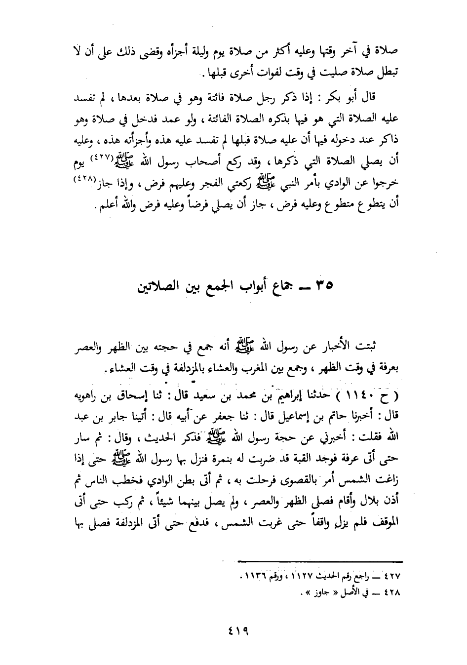 جِمَاعُ أَبْوَابِ الْجَمْعِ بَيْنَ الصَّلَاتَيْنِ ثَبَتَتِ الْأَخْبَارُ عَنْ رَسُولِ اللهِ صَلَّى اللَّهُ عَلَيْهِ وَسَلَّمَ أَنَّهُ جَمَعَ فِي حَجَّتِهِ بَيْنَ الظُّهْرِ وَالْعَصْرِ بِعَرَفَةَ فِي وَقْتِ الظُّهْرِ وَجَمَعَ بَيْنَ الْمَغْرِبِ وَالْعِشَاءِ بِالْمُزْدَلِفَةِ فِي وَقْتِ الْعِشَاءِ