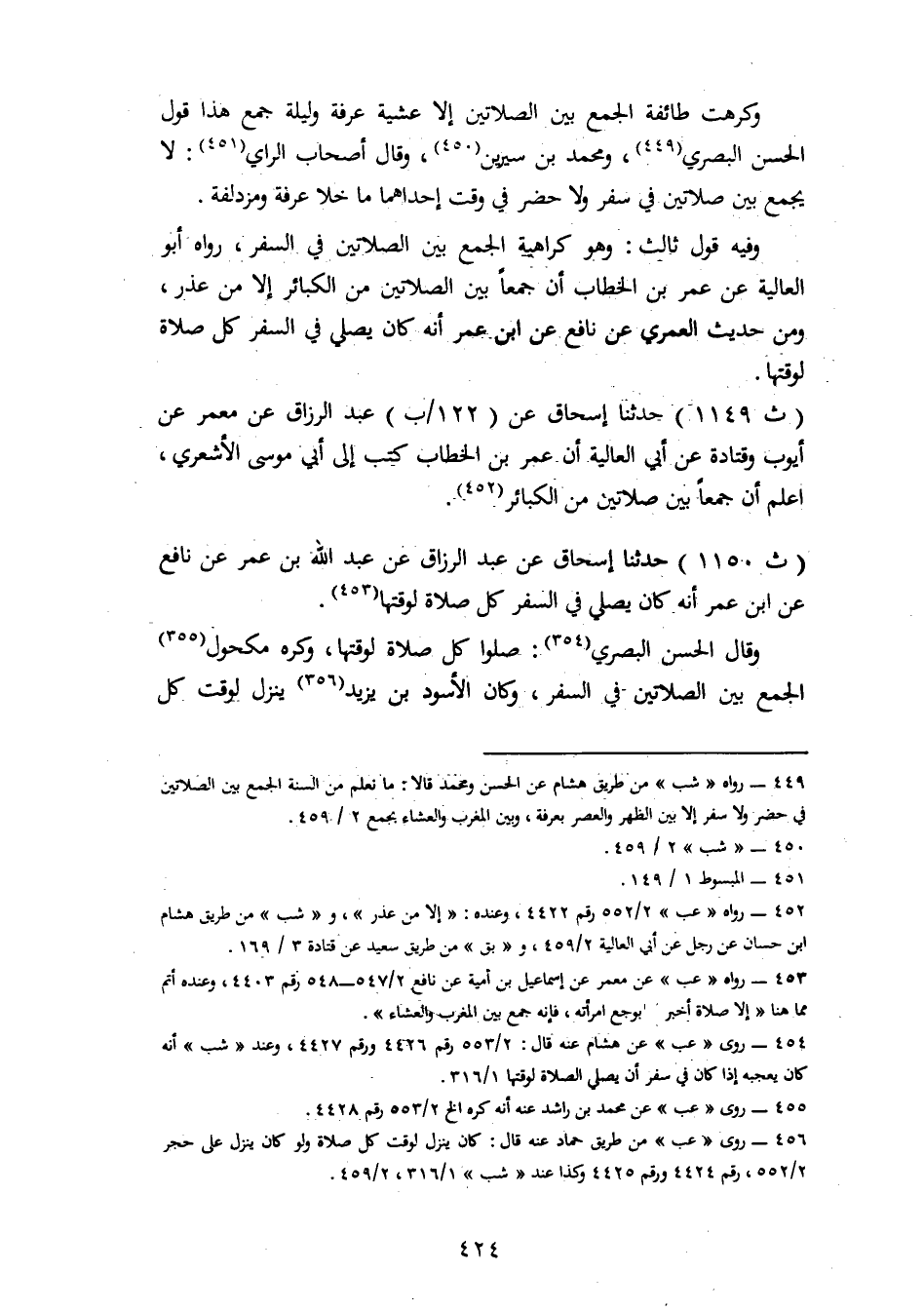 1150 - حَدَّثَنَا إِسْحَاقُ، عَنْ عَبْدِ الرَّزَّاقِ، عَنْ عَبْدِ اللهِ بْنِ عُمَرَ، عَنْ نَافِعٍ، عَنِ ابْنِ عُمَرَ، «أَنَّهُ كَانَ يُصَلِّي فِي السَّفَرِ كُلَّ صَلَاةٍ لِوَقْتِهَا» وَقَالَ الْحَسَنُ الْبَصْرِيُّ: صَلُّوا كُلَّ صَلَاةٍ لِوَقْتِهَا، وَكَرِهَ مَكْحُولٌ الْجَمْعَ بَيْنَ الصَّلَاتَيْنِ فِي السَّفَرِ وَكَانَ الْأَسْوَدُ بْنُ يَزِيدَ يَنْزِلُ لِوَقْتِ كُلِّ -[425]- صَلَاةٍ، وَقَالَ النَّخَعِيُّ: كَانُوا لَا يَجْمَعُونَ فِي السَّفَرِ وَلَا يُصَلُّونَ إِلَّا رَكْعَتَيْنِ قَالَ أَبُو بَكْرٍ: أَمَّا حَدِيثُ عُمَرَ بْنِ الْخَطَّابِ غَيْرُ ثَابِتٍ عَنْهُ لِانْقِطَاعِ إِسْنَادِهِ، وَلَيْسَ يَخْلُو خَبَرُ الْعُمَرِيِّ عَنْ نَافِعٍ مِنْ أَحَدِ أَمْرَيْنِ، إِمَّا أَنْ يَكُونَ فَعَلَ ذَلِكَ فِي حَالٍ وَجَمَعَ بَيْنَ الصَّلَاتَيْنِ فِي حَالٍ، فَلَا تَكُونُ صَلَاتُهُ كُلَّ صَلَاةٍ لِوَقْتِهَا خِلَافًا لِجَمْعِهِ بَيْنَ الصَّلَاتَيْنِ إِذْ كُلُّ ذَلِكَ مُبَاحٌ جَائِزٌ فِعْلُهُ أَوْ يَتَحَامَلُ مُتَحَامِلٌ فَيَقُولُ: إِنَّ فِي رِوَايَةِ الْعُمَرِيِّ عَنْ نَافِعٍ عَنِ ابْنِ عُمَرَ تَقِيًّا لِأَنْ يَكُونَ ابْنُ عُمَرَ جَمَعَ فِي حَالٍ، وَهَذَا يَبْعُدُ لِأَنَّ الَّذِي رَوَى عَنْ نَافِعٍ عَنِ ابْنِ عُمَرَ أَنَّهُ كَانَ يَجْمَعُ بَيْنَ الصَّلَاتَيْنِ أَتْقَنُ مِنْ عَبْدِ اللهِ وَأَحْفَظُ مِنْهُ لِلرِّوَايَةِ مَعَ أَنَّ عَبْدَ اللهِ إِذَا انْفَرَدَ بِرِوَايَةٍ عَنْ نَافِعٍ عَنِ ابْنِ عُمَرَ فَلَيْسَ بِحُجَّةٍ، فَإِذَا انْفَرَدَ غَيْرُهُ مِمَّنْ رَوَوْا عَنْ نَافِعٍ عَنِ ابْنِ عُمَرَ أَنَّهُ جَمَعَ بَيْنَ الصَّلَاتَيْنِ، فَرِوَايَتُهُ حُجَّةٌ وَالَّذِينَ رَوَوْا ذَلِكَ عَنْ نَافِعٍ جَمَاعَةٌ كُلُّهُمْ مُتْقِنٌ لِحَدِيثِ نَافِعٍ ضَابِطٌ لَهُ مِنْهُمْ أَيُّوبُ وَعُبَيْدُ اللهِ بْنُ عُمَرَ وَمُوسَى بْنُ عُقْبَةَ وَيَحْيَى الْأَنْصَارِيُّ وَرَوَى ذَلِكَ عَنْ نَافِعٍ طَبَقَةٌ ثَانِيَةٌ مُحَمَّدُ بْنُ إِسْحَاقَ وَعَبْدُ الْعَزِيزِ بْنُ أَبِي رَوَّادٍ وَعُمَرُ بْنُ نَافِعٍ مَعَ أَنَّ عَبْدَةَ بْنَ سُلَيْمَانَ قَدْ خَالَفَ عَبْدَ الرَّزَّاقِ فِي رِوَايَتِهِ عَنْ عُبَيْدِ اللهِ بْنِ عُمَرَ رَوَى إِسْحَاقُ بْنُ رَاهَوَيْهِ عَنْ عَبْدَةَ بْنِ سُلَيْمَانَ عَنْ عُبَيْدِ اللهِ عَنْ نَافِعٍ عَنِ ابْنِ عُمَرَ أَنَّهُ جَدَّ بِهِ السَّيْرُ فَأَخَّرَ الْمَغْرِبَ حَتَّى غَابَ الشَّفَقُ ثُمَّ نَزَلَ فَجَمَعَ بَيْنَهُمَا، قَالَ أَبُو بَكْرٍ: وَبِالْأَخْبَارِ الثَّابِتَةِ عَنْ رَسُولِ اللهِ صَلَّى اللَّهُ عَلَيْهِ وَسَلَّمَ أَقُولُ وَلَا مَعْنَى لِكَرَاهِيَةِ مَنْ كَرِهَ مَا سَنَّهُ رَسُولُ اللهِ صَلَّى اللَّهُ عَلَيْهِ وَسَلَّمَ لِأُمَّتِهِ إِذْ مَا قَالُوا مِنْ ذَلِكَ خِلَافُ السُّنَنِ الثَّابِتَةِ، وَالسُّنَّةُ إِذَا ثَبَتَتِ اسْتُغْنِيَ بِهَا عَنْ كُلِّ قَوْلٍ