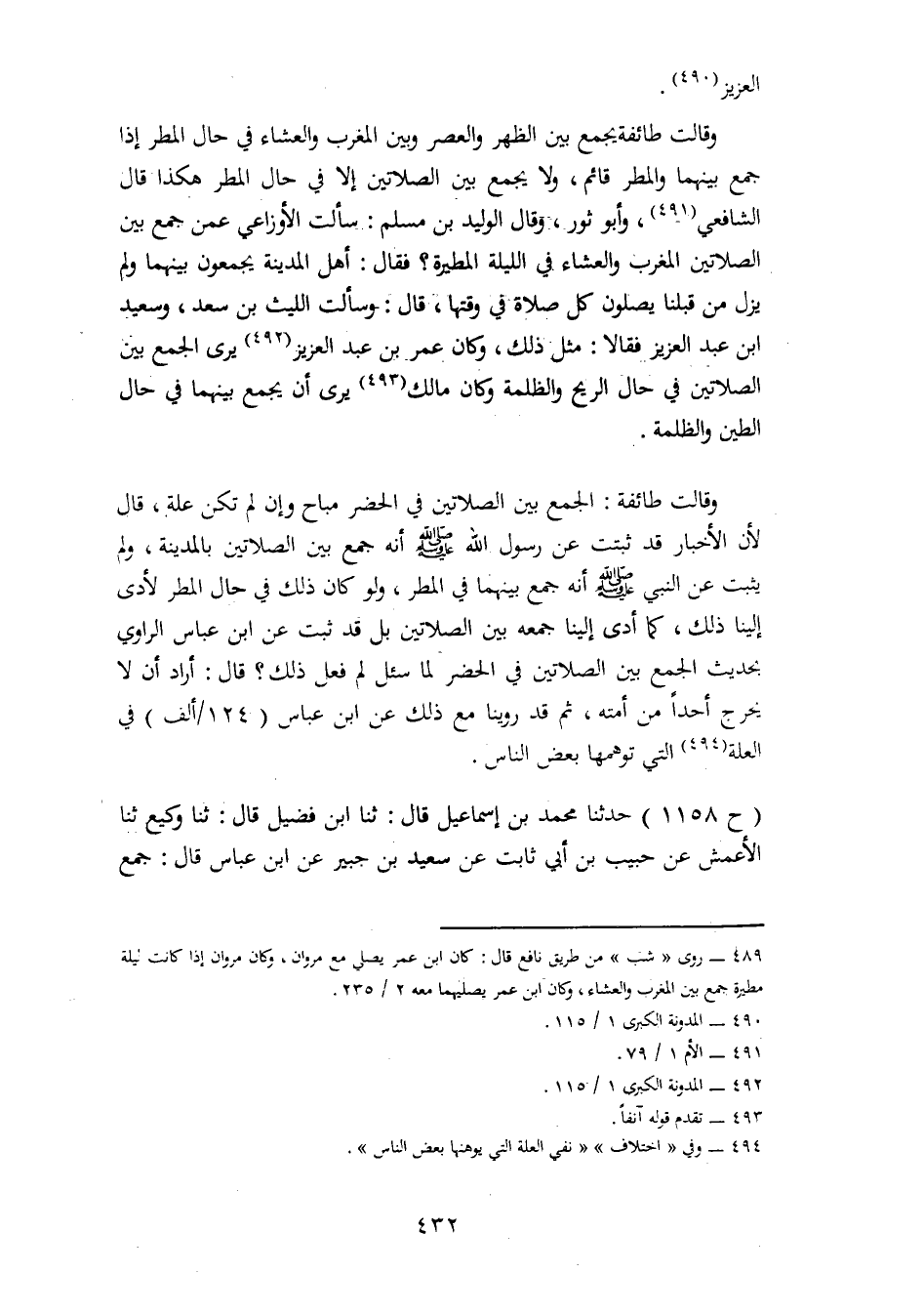 1158 - حَدَّثَنَا مُحَمَّدُ بْنُ إِسْمَاعِيلَ، قَالَ: ثنا ابْنُ فُضَيْلٍ، قَالَ: ثنا وَكِيعٌ، ثنا الْأَعْمَشُ، عَنْ حَبِيبِ بْنِ أَبِي ثَابِتٍ، عَنْ سَعِيدِ بْنِ جُبَيْرٍ، عَنِ ابْنِ عَبَّاسٍ، قَالَ: «جَمَعَ -[433]- رَسُولُ اللهِ صَلَّى اللَّهُ عَلَيْهِ وَسَلَّمَ بَيْنَ الظُّهْرِ وَالْعَصْرِ وَبَيْنَ الْمَغْرِبِ وَالْعِشَاءِ مِنْ غَيْرِ خَوْفٍ وَلَا مَطَرٍ» قُلْتُ لِابْنِ عَبَّاسٍ: لِمَ فَعَلَ ذَلِكَ؟ قَالَ: لِكَيْ لَا يُحْرِجَ أُمَّتَهُ