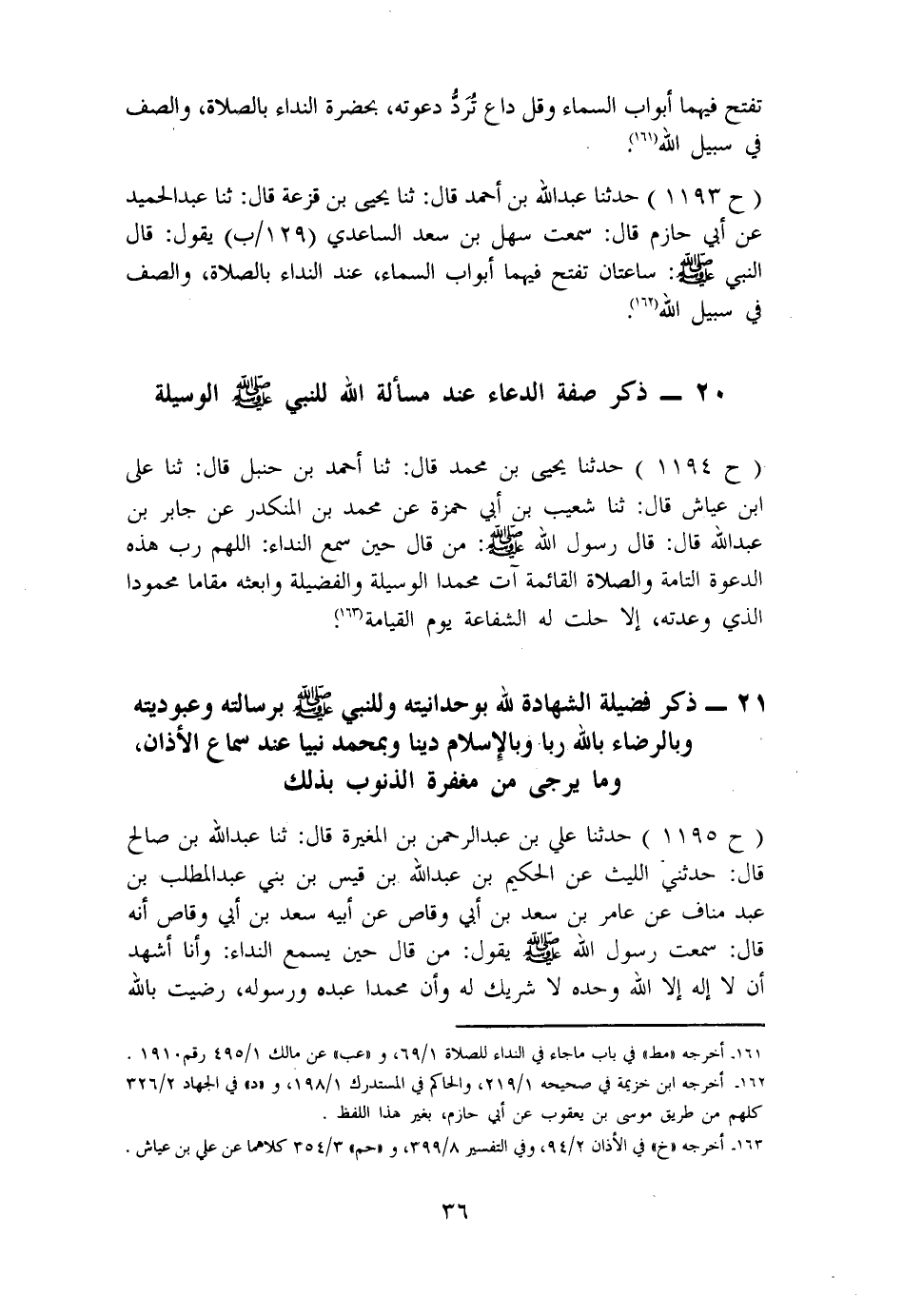 1193 - حَدَّثنا عَبْدُ اللهِ بْنُ أَحْمَدَ، قَالَ: ثنا يَحْيَى بْنُ قَزَعَةَ، قَالَ: ثنا عَبْدُ الْحَمِيدِ، عَنْ أَبِي حَازِمٍ، قَالَ: سَمِعْتُ سَهْلَ بْنَ سَعْدٍ السَّاعِدِيَّ، يَقُولُ: قَالَ النَّبِيُّ صَلَّى اللَّهُ عَلَيْهِ وَسَلَّمَ: «سَاعَتَانِ تُفْتَحُ فِيهِمَا أَبْوَابُ السَّمَاءِ، عِنْدَ النِّدَاءِ بِالصَّلَاةِ، وَالصَّفِّ فِي سَبِيلِ اللهِ»
