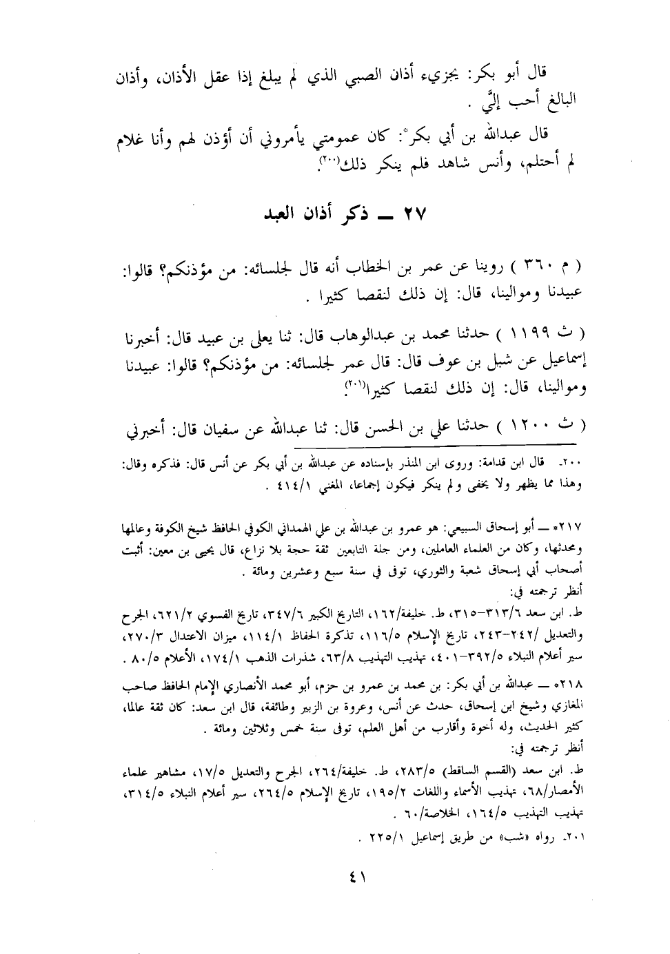 1200 - حَدَّثنا عَلِيُّ بْنُ الْحَسَنِ، قَالَ: ثنا عَبْدُ اللهِ، عَنْ سُفْيَانَ، قَالَ: أَخْبَرَنِي -[42]- ابْنُ يَمَانٍ، قَالَ: حَدَّثَنِي قَيْسُ بْنُ أَبِي حَازِمٍ، أَنَّ عُمَرَ بْنَ الْخَطَّابِ، قَالَ: «لَوْ أَطَلَّقْتُ التَّأْذِينَ مَعَ الْخَلِيفَةِ لَأَذَّنَتْ يَعْنِي الْخِلَافَةَ» قَالَ أَبُو بَكْرٍ: قَالَ بَعْضُ أَهْلِ الْعِلْمِ: هَذَا يَدُلُّ عَلَى أَنَّهُ أَحَبَّ أَنْ يُقَدِّمَ أَهْلَ الْفَضْلِ عَلَى غَيْرِهِمْ فِي الْأَذَانِ، فَإِنْ أَذَّنَ عَبْدٌ، أَوْ مُكَاتِبٌ، أَوْ مُدَبِّرٌ أَجْزَأَ فِي قَوْلِ الشَّافِعِيِّ، وَإِسْحَاقِ، وَالنُّعْمَانِ، وَيَعْقُوبَ، وَمُحَمَّدٍ، وَقَوْلُ كُلِّ مَنْ نَحْفَظُ عَنْهُمْ مِنْ أَهْلِ الْعِلْمِ