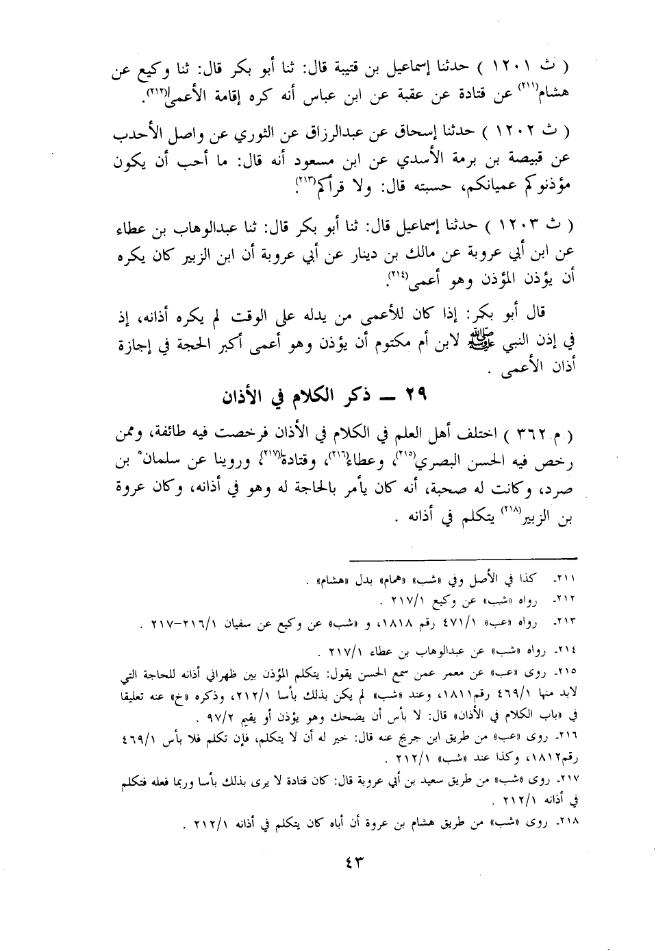 1201 - حَدَّثنا إِسْمَاعِيلُ بْنُ قُتَيْبَةَ، قَالَ: ثنا أَبُو بَكْرٍ، قَالَ: ثنا وَكِيعٌ، عَنْ هِشَامٍ، عَنْ قَتَادَةَ، عَنْ عُقْبَةَ، عَنِ ابْنِ عَبَّاسٍ: «أَنَّهُ كَرِهَ إِقَامَةَ الْأَعْمَى»