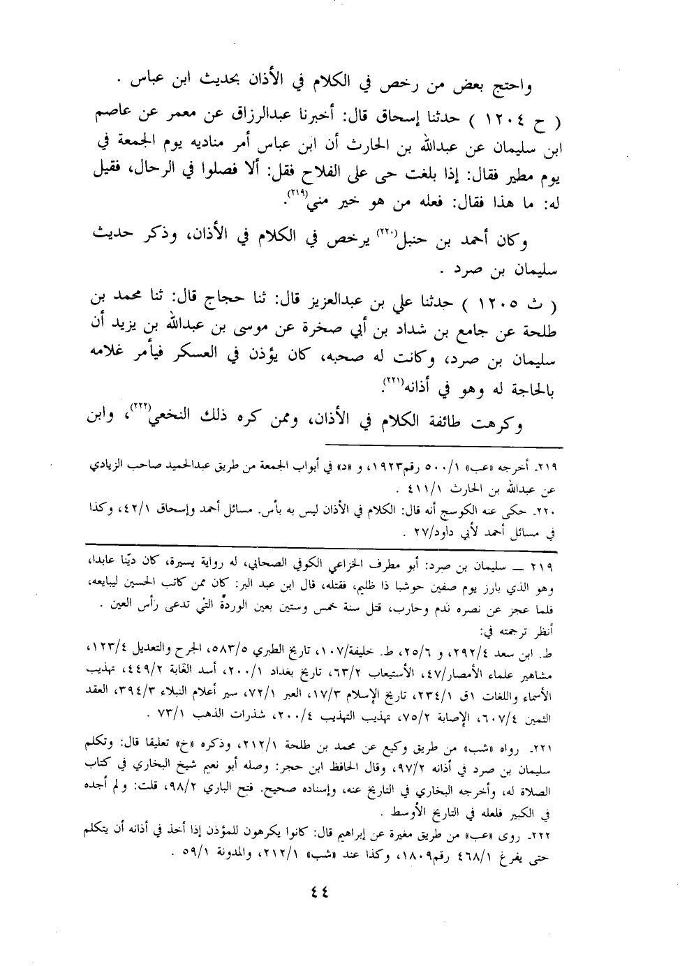 1205 - حَدَّثنا عَلِيُّ بْنُ عَبْدِ الْعَزِيزِ، قَالَ: ثنا حَجَّاجٌ، قَالَ: ثنا مُحَمَّدُ بْنُ طَلْحَةَ، عَنْ جَامِعِ بْنِ شَدَّادِ بْنِ أَبِي صَخْرَةَ، عَنْ مُوسَى بْنِ عَبْدِ اللهِ بْنِ يَزِيدَ، أَنَّ سُلَيْمَانَ بْنَ صُرَدَ، وَكَانَتْ لَهُ صُحْبَةٌ: «كَانَ يُؤَذِّنُ فِي الْعَسْكَرِ فَيَأْمُرُ غُلَامَهُ بِالْحَاجَةِ لَهُ وَهُوَ فِي أَذَانِهِ» وَكَرِهَتْ طَائِفَةٌ الْكَلَامَ فِي الْأَذَانِ، وَمِمَّنْ كَرِهَ ذَلِكَ النَّخَعِيُّ، وَابْنُ -[45]- سِيرِينَ، وَالْأَوْزَاعِيُّ، وَقَالَ مَالِكٌ: لَمْ نَعْلَمْ أَحَدًا يُقْتَدَى بِهِ تَكَلَّمَ بَيْنَ ظَهْرَانَيْ أَذَانِهِ. وَقَالَ الثَّوْرِيُّ: وَإِذَا أَذَّنَ وَأَقَامَ فَلَا يَتَكَلَّمُ فِيهِمَا، وَلَا بَأْسَ أَنْ يَتَكَلَّمَ بَيْنَهُمَا. وَقَالَ الشَّافِعِيُّ: أُحِبُّ أَلَّا يَتَكَلَّمَ فِي أَذَانِهِ فَإِنْ تَكَلَّمَ فَلَا يُعِيدُ. وَقَالَ إِسْحَاقُ: لَا يَنْبَغِي لِلْمُؤَذِّنِ أَنْ يَتَكَلَّمَ فِي أَذَانِهِ، إِلَّا كَلَامًا مِنْ شَأْنِ الصَّلَاةِ نَحْوَ: صَلُّوا فِي رِحَالِكُمْ. وَقَالَ النُّعْمَانُ، وَيَعْقُوبُ وَمُحَمَّدٌ: لَا يَتَكَلَّمُ فِي أَذَانِهِ وَإِقَامَتِهِ فَإِنْ تَكَلَّمَ فِي أَذَانِهو وَصَلَّى الْقَوْمُ فَصَلَاتُهُمْ تَامَّةٌ. وَقَدْ رُوِّينَا عَنِ الزُّهْرِيِّ أَنَّهُ قَالَ: إِذَا تَكَلَّمَ الرَّجُلُ فِي الْإِقَامَةِ أَعَادَ الْإِقَامَةَ. قَالَ أَبُو بَكْرٍ: أَحْسَنُ مَا قِيلَ فِي هَذَا الْبَابِ الرُّخْصَةُ فِي الْكَلَامِ فِي الْأَذَانِ مِمَّا هُوَ مِنْ شَأْنِ الصَّلَاةِ كَمَا قَالَ إِسْحَاقُ، وَعَلَى ذَلِكَ يَدُلُّ حَدِيثُ ابْنِ عَبَّاسٍ، فَإِنْ تَكَلَّمَ بِمَا لَيْسَ مِنَ الصَّلَاةِ فَهُوَ مَكْرُوهٌ، وَلَا يَجُوزُ أَنْ يَبْطُلَ أَذَانُهُ وَإِقَامَتُهُ، إِذْ لَا حُجَّةَ تَدُلُّ عَلَى إِبْطَالِ أَذَانِ مَنْ تَكَلَّمَ فِي أَذَانِهِ