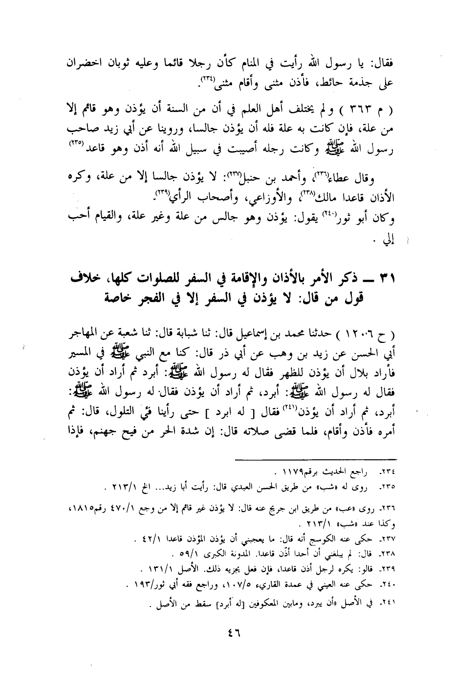 فَقَالَ: يَا رَسُولَ اللهِ رَأَيْتُ فِي الْمَنَامِ كَأَنَّ رَجُلًا قَائِمًا وَعَلَيْهِ ثَوْبَانِ أَخْضَرَانِ عَلَى جِذْمَةِ حَائِطٍ، فَأَذَّنَ مَثْنَى وَأَقَامَ مَثْنَى , وَلَمْ يَخْتَلِفْ أَهْلُ الْعِلْمِ فِي أَنَّ مِنَ السُّنَّةِ أَنْ يُؤَذِّنَ وَهُوَ قَائِمٌ إِلَّا مِنْ عِلَّةٍ، فَإِنْ كَانَتْ بِهِ عِلَّةٌ فَلَهُ أَنْ يُؤَذِّنَ جَالِسًا، وَرُوِّينَا عَنْ أَبِي زَيْدٍ صَاحِبِ رَسُولِ اللهِ صَلَّى اللَّهُ عَلَيْهِ وَسَلَّمَ وَكَانَتْ رِجْلُهُ أُصِيبَتْ فِي سَبِيلِ اللهِ أَنَّهُ أَذَّنَ وَهُوَ قَاعِدٌ. وَقَالَ عَطَاءٌ، وَأَحْمَدُ بْنُ حَنْبَلٍ: لَا يُؤَذِّنُ جَالِسًا إِلَّا مِنْ عِلَّةٍ. وَكَرِهَ الْأَذَانَ قَاعِدًا مَالِكٌ، وَالْأَوْزَاعِيُّ، وَأَصْحَابُ الرَّأْيِ. وَكَانَ أَبُو ثَوْرٍ يَقُولُ: يُؤَذِّنُ وَهُوَ جَالِسٌ مِنْ عِلَّةٍ وَغَيْرِ عِلَّةٍ، وَالْقِيَامُ أَحَبُّ إِلَيَّ