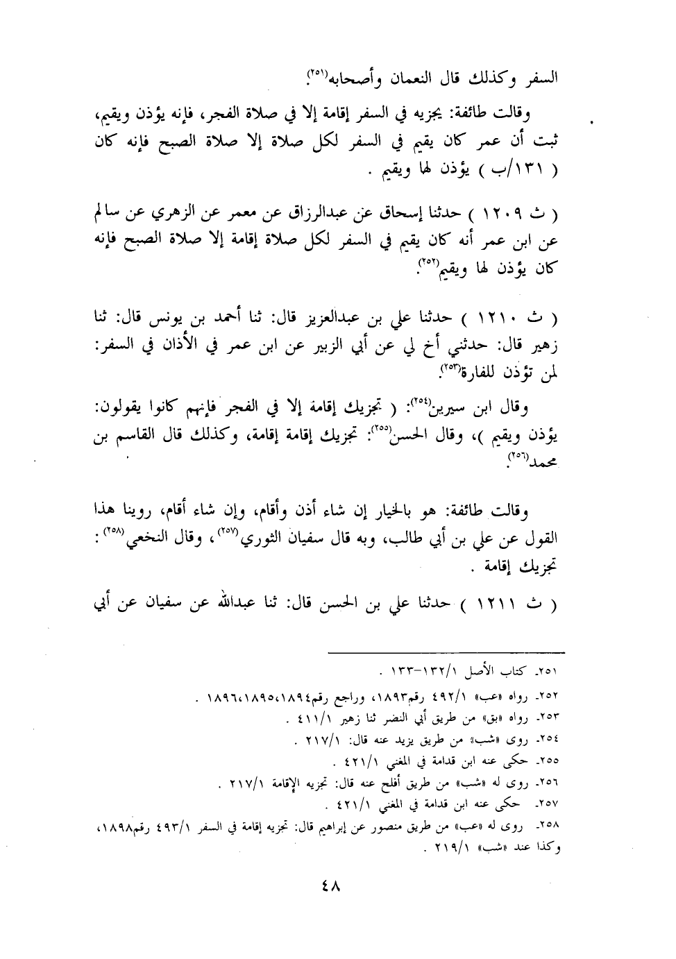 1211 - حَدَّثنا عَلِيُّ بْنُ الْحَسَنِ، قَالَ: ثنا عَبْدُ اللهِ، عَنْ سُفْيَانَ، عَنْ أَبِي -[49]- إِسْحَاقَ، عَنْ عَاصِمِ بْنِ ضَمْرَةَ، عَنْ عَلِيٍّ أَنَّهُ قَالَ: «الْمُسَافِرُ إِنْ شَاءَ أَذَّنَ وَأَقَامَ، وَإِنْ شَاءَ أَقَامَ» وَقَدْ رُوِّينَا عَنْ مُجَاهِدٍ أَنَّهُ قَالَ: «إِذَا نَسِيَ الْإِقَامَةَ فِي السَّفَرِ أَعَادَ» قَالَ أَبُو بَكْرٍ: فَإِنْ أَرَادَ الْمُسَافِرُ الْجَمْعَ بَيْنَ الصَّلَاتَيْنِ أَذَّنَ لِلْأُولَى مِنَ الصَّلَاتَيْنِ ثُمَّ أَقَامَ لِلْأُخْرَى كَمَا أَمَرَ النَّبِيُّ صَلَّى اللَّهُ عَلَيْهِ وَسَلَّمَ بِلَالًا أَنْ يَفْعَلَ بِعَرَفَةَ وَمُزْدَلِفَةِ فِي حَجَّتِهِ