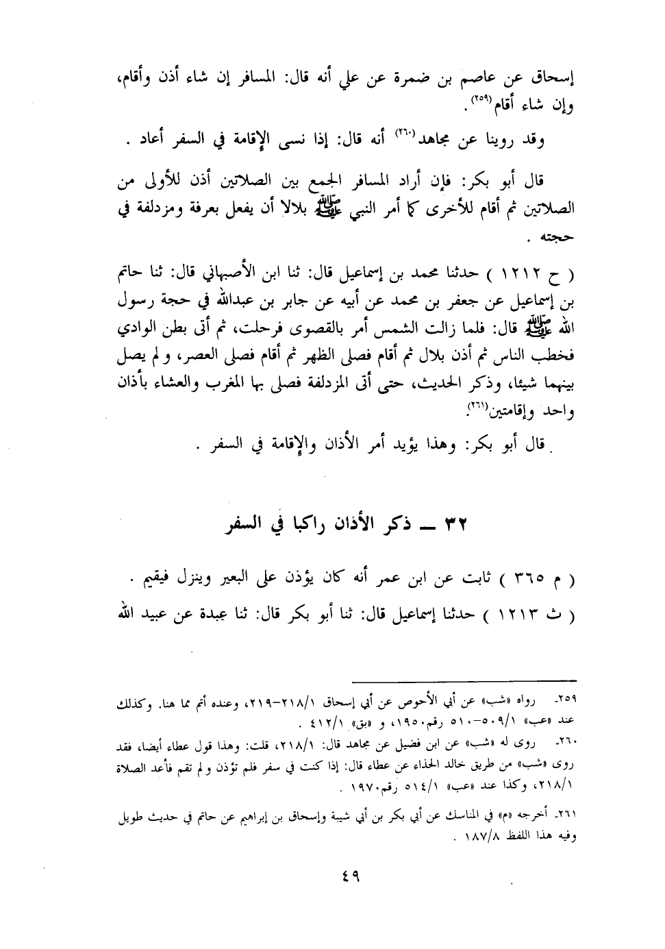 1213 - حَدَّثنا إِسْمَاعِيلُ، قَالَ: ثنا أَبُو بَكْرٍ، قَالَ: ثنا عَبْدَةُ، عَنْ عُبَيْدِ اللهِ، -[50]- عَنْ نَافِعٍ، عَنِ ابْنِ عُمَرَ وَمِمَّنْ رَأَى أَنْ يُؤَذِّنَ رَاكِبًا سَالِمُ بْنُ عَبْدِ اللهِ، وَرِبْعِيُّ بْنُ حِرَاشٍ، وَبِهِ قَالَ: مَالِكُ بْنُ أَنَسٍ، الْأَوْزَاعِيُّ، وَسُفْيَانُ الثَّوْرِيُّ، وَالشَّافِعِيُّ، وَأَحْمَدُ، وَإِسْحَاقُ، وَأَبُو ثَوْرٍ، وَهُوَ مَذْهَبُ النُّعْمَانِ وَأَصْحَابِهِ وَقَالَ مَالِكٌ: «لَا يُقِيمُ وَهُوَ رَاكِبٌ» قَالَ أَبُو بَكْرٍ: سَنَّ رَسُولُ اللهِ صَلَّى اللَّهُ عَلَيْهِ وَسَلَّمَ الْأَذَانَ، فَإِذَا أَتَى بِالْأَذَانِ فَقَدْ أَتَى بِهِ رَاكِبًا أَذَّنَ أَوْ نَازِلًا، وَلَا نَحْفَظُ مَنْعَ الْمُؤَذِّنِ أَنْ يُؤَذِّنَ رَاكِبًا عَنْ أَحَدٍ مِنْ أَهْلِ الْعِلْمِ
