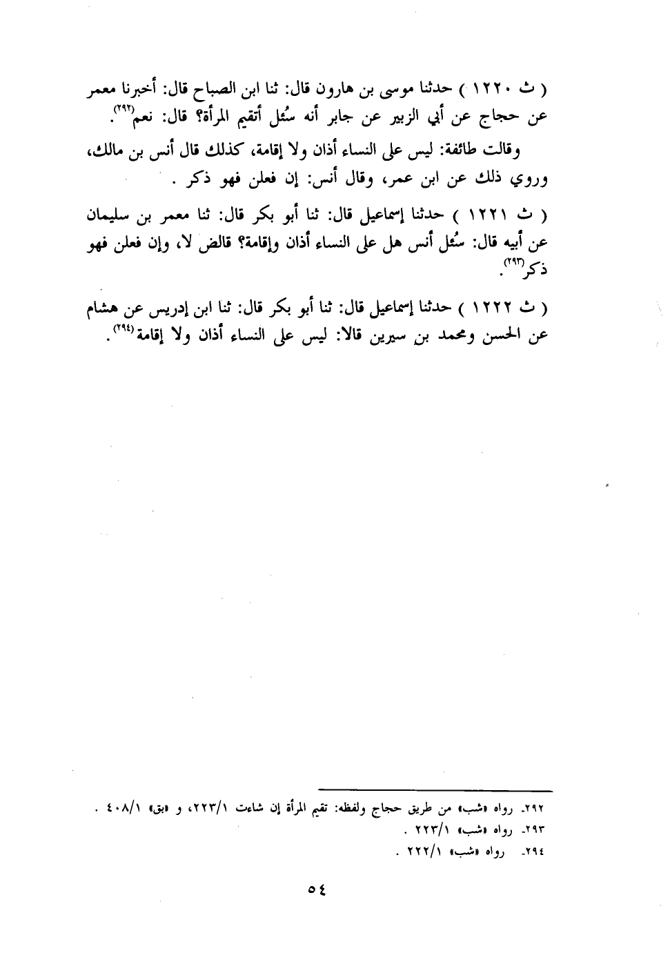 1222 - حَدَّثنا إِسْمَاعِيلُ، قَالَ: ثنا أَبُو بَكْرٍ، قَالَ: ثنا ابْنُ إِدْرِيسَ، عَنْ هِشَامٍ، عَنِ الْحَسَنِ، وَمُحَمَّدِ بْنِ سِيرِينَ، قَالَا: «لَيْسَ عَلَى النِّسَاءِ أَذَانٌ وَلَا إِقَامَةٌ» -[55]-