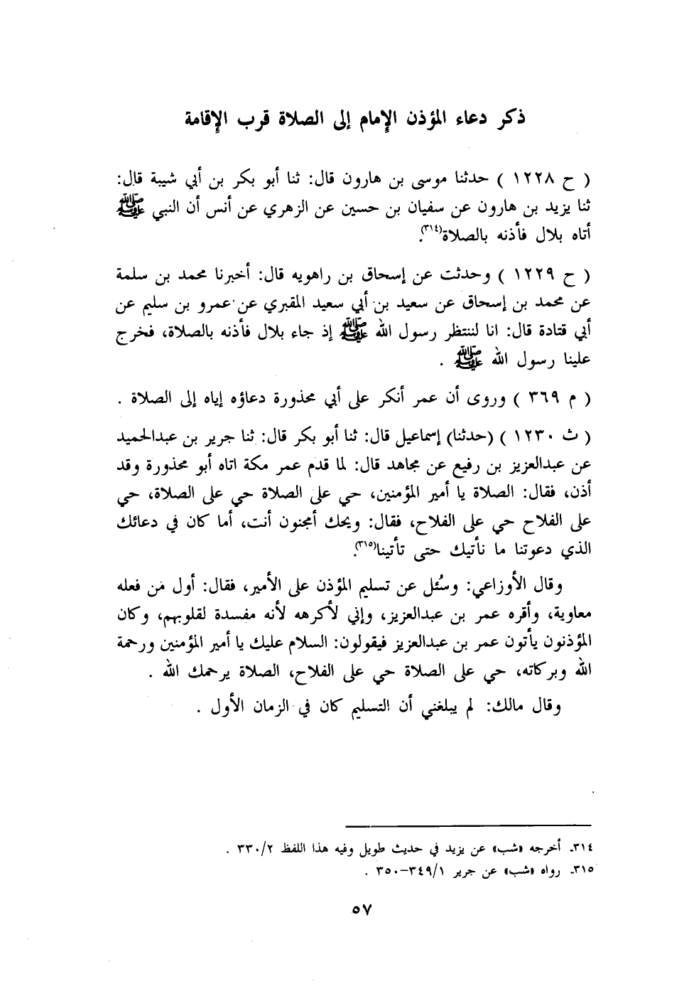 1230 - حَدَّثنا إِسْمَاعِيلُ، قَالَ: ثنا أَبُو بَكْرٍ، قَالَ: ثنا جَرِيرُ بْنُ عَبْدِ الْحَمِيدِ، عَنْ عَبْدِ الْعَزِيزِ بْنِ رُفَيْعٍ، عَنْ مُجَاهِدٍ، قَالَ: " لَمَّا قَدِمَ عُمَرُ مَكَّةَ، أَتَاهُ أَبُو مَحْذُورَةَ، وَقَدْ أَذَّنَ، فَقَالَ: الصَّلَاةُ يَا أَمِيرَ الْمُؤْمِنِينَ، حَيَّ عَلَى الصَّلَاةِ، حَيَّ عَلَى الصَّلَاةِ، حَيَّ عَلَى الْفَلَاحِ، حَيَّ عَلَى الْفَلَاحِ، فَقَالَ: وَيْحَكَ أَمَجْنُونٌ أَنْتَ، أَمَا كَانَ فِي دُعَائِكَ الَّذِي دَعَوْتَنَا مَا نَأْتِيكَ، حَتَّى تَأْتِيَنَا " وَقَالَ الْأَوْزَاعِيُّ: وَسُئِلَ عَنْ تَسْلِيمِ الْمُؤَذِّنِ عَلَى الْأَمِيرِ، فَقَالَ: أَوَّلُ مَنْ فَعَلَهُ مُعَاوِيَةُ، وَأَقَرَّهُ عُمَرُ بْنُ عَبْدِ الْعَزِيزِ، وَإِنِّي لَأَكْرَهُهُ لِأَنَّهُ مَفْسَدَةٌ لِقُلُوبِهِمْ، وَكَانَ الْمُؤَذِّنُونَ يَأْتُونَ عُمَرَ بْنَ عَبْدِ الْعَزِيزِ فَيَقُولُونَ: السَّلَامُ عَلَيْكَ يَا أَمِيرَ الْمُؤْمِنِينَ وَرَحْمَةُ اللهِ وَبَرَكَاتُهُ، حَيَّ عَلَى الصَّلَاةِ حَيَّ عَلَى الْفَلَاحِ، الصَّلَاةَ يَرْحَمُكُ اللهُ. وَقَالَ مَالِكٌ: لَمْ يَبْلُغْنِي أَنَّ التَّسْلِيمَ كَانَ فِي الزَّمَانِ الْأَوَّلِ