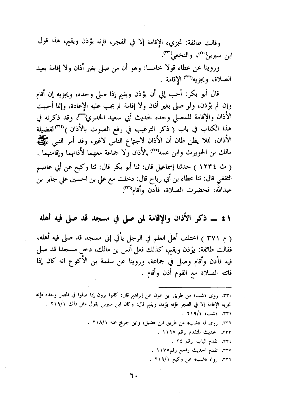 ذِكْرُ الْأَذَانِ وَالْإِقَامَةِ لِمَنْ صَلَّى فِي مَسْجِدٍ قَدْ صَلَّى فِيهِ أَهْلُهُ اخْتَلَفَ أَهْلُ الْعِلْمِ فِي الرَّجُلِ يَأْتِي إِلَى مَسْجِدٍ قَدْ صَلَّى فِيهِ أَهْلُهُ، فَقَالَتْ طَائِفَةٌ: يُؤَذِّنُ وَيُقِيمُ، كَذَلِكَ فَعَلَ أَنَسُ بْنُ مَالِكٍ، دَخَلَ مَسْجِدًا قَدْ صُلِّيَ فِيهِ فَأَذَّنَ وَأَقَامَ وَصَلَّى فِي جَمَاعَةٍ، وَرُوِّينَا عَنْ سَلَمَةَ بْنِ الْأَكْوَعِ أَنَّهُ كَانَ إِذَا فَاتَتْهُ الصَّلَاةُ مَعَ الْقَوْمِ أَذَّنَ وَأَقَامَ