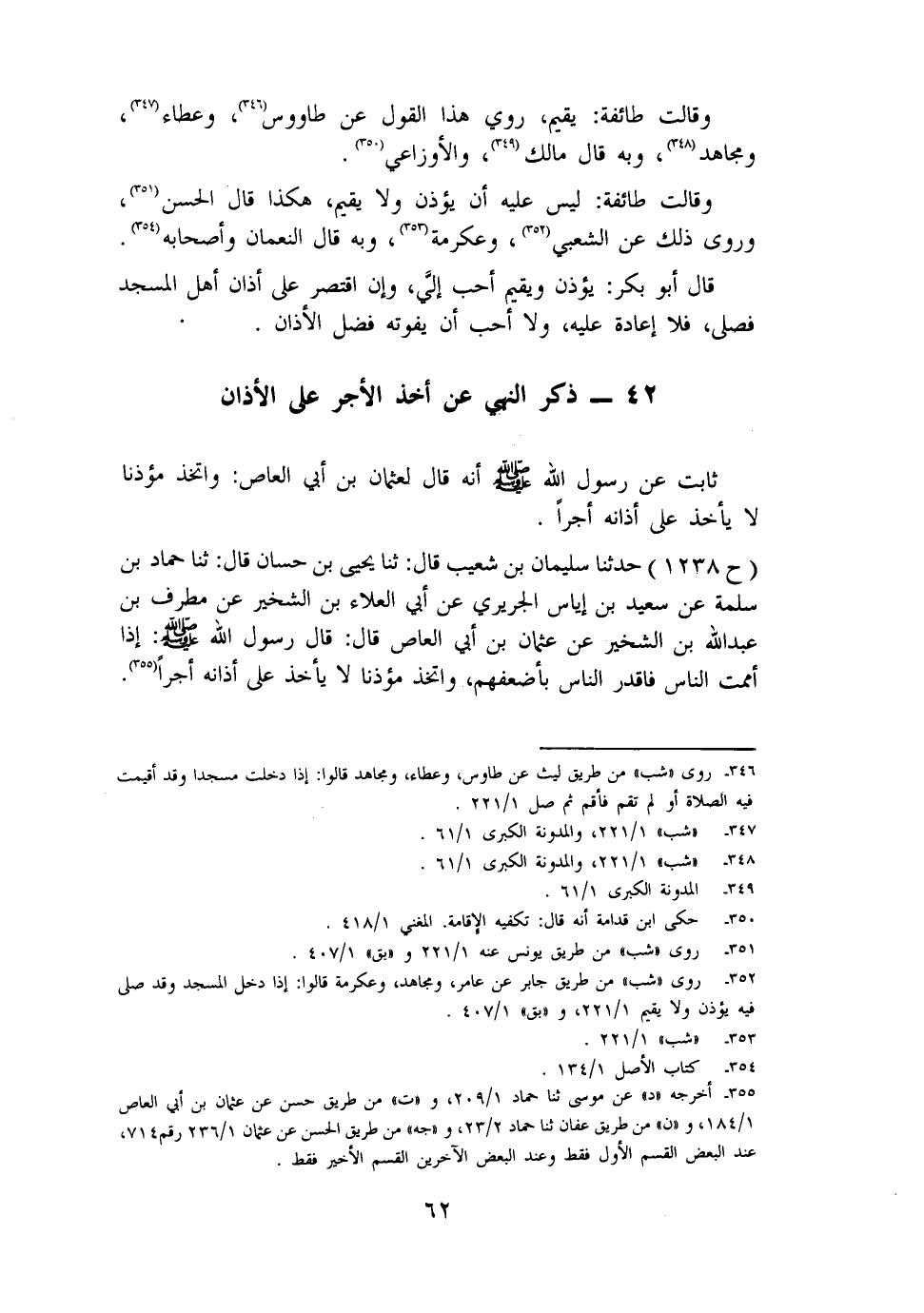 1238 - حَدَّثنا سُلَيْمَانُ بْنُ شُعَيْبٍ، قَالَ: ثنا يَحْيَى بْنُ حَسَّانَ، قَالَ: ثنا حَمَّادُ بْنُ سَلَمَةَ، عَنْ سَعِيدِ بْنِ إِيَاسَ الْجُرَيْرِيِّ، عَنْ أَبِي الْعَلَاءِ بْنِ الشِّخِّيرِ، عَنْ مُطَرِّفِ بْنِ عَبْدِ اللهِ بْنِ الشِّخِّيرِ، عَنْ عُثْمَانَ بْنِ أَبِي الْعَاصِ، قَالَ: قَالَ رَسُولُ اللهِ صَلَّى اللَّهُ عَلَيْهِ وَسَلَّمَ: «إِذَا أَمَمْتَ النَّاسَ فَاقْدِرِ النَّاسَ بِأَضْعَفِهِمْ، وَاتَّخِذْ مُؤَذِّنًا لَا يَأْخُذُ عَلَى أَذَانِهِ أَجْرًا» -[63]- وَاخْتَلَفَ أَهْلُ الْعِلْمِ فِي أَخْذِ الْأَجْرِ عَلَى الْأَذَانِ فَكَرِهَتْ طَائِفَةٌ أَخْذَ الْأَجْرِ عَلَى الْأَذَانِ، وَمِمَّنْ كَرِهَ ذَلِكَ الْقَاسِمُ بْنُ عَبْدِ الرَّحْمَنِ، وَرُوِيَ ذَلِكَ عَنِ الضَّحَّاكِ بْنِ مُزَاحِمٍ، وَقَتَادَةَ، وَرُوِّينَا عَنِ ابْنِ عُمَرَ أَنَّهُ قَالَ لِمُؤَذِّنٍ: إِنِّي أُبْغِضُكَ فِي اللهِ إِنَّكَ تَأْخُذُ عَلَى أَذَانِكَ أَجْرًا