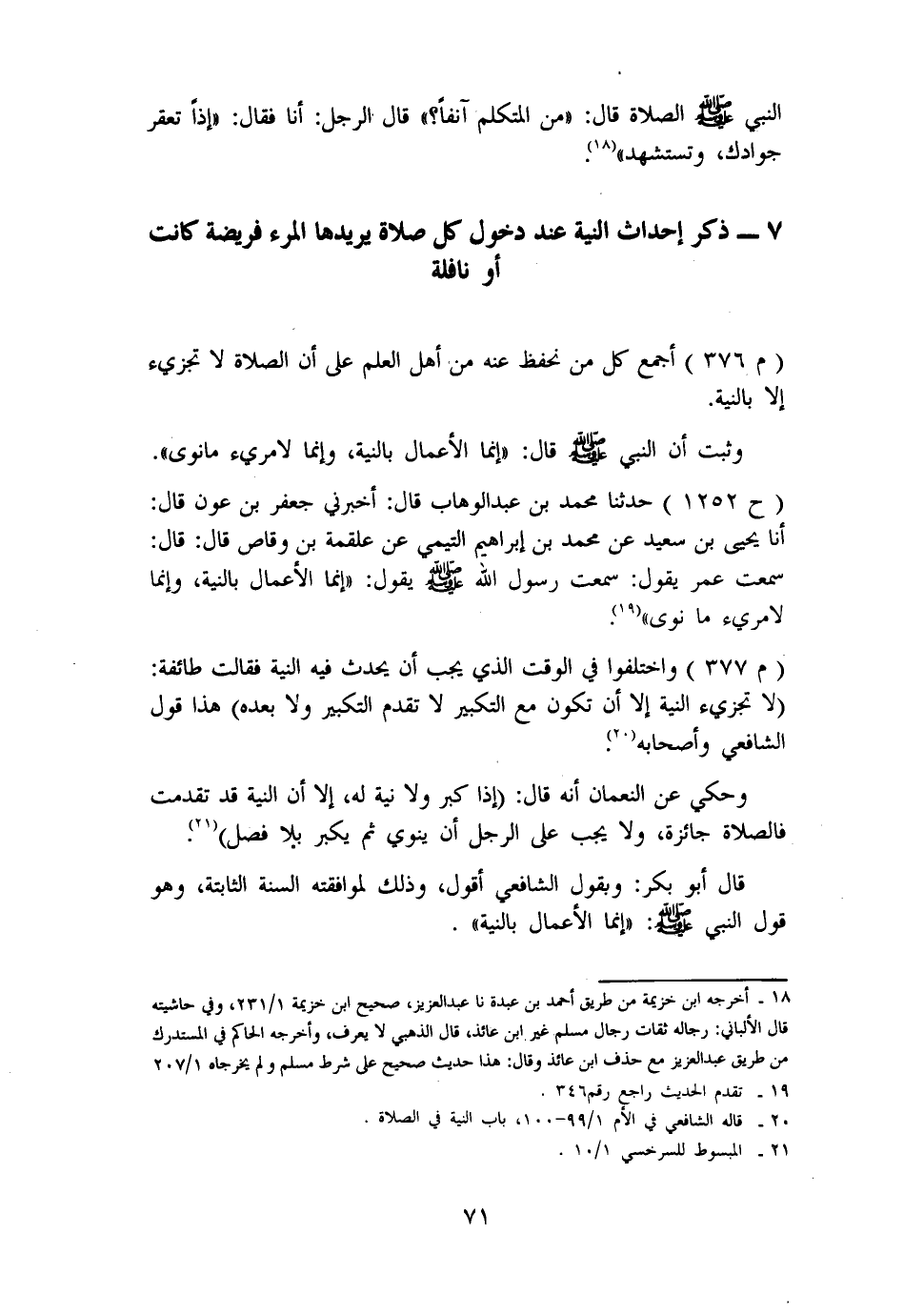ذِكْرُ إِحْدَاثِ النِّيَّةِ عِنْدَ دُخُولِ كُلِّ صَلَاةٍ يُرِيدُهَا الْمَرْءُ فَرِيضَةً كَانَتْ أَوْ نَافِلَةً أَجْمَعَ كُلُّ مَنْ نَحْفَظُ عَنْهُ مِنْ أَهْلِ الْعِلْمِ عَلَى أَنَّ الصَّلَاةَ لَا تُجْزِئُ إِلَّا بِالنِّيَّةِ، وَثَبَتَ أَنَّ النَّبِيَّ صَلَّى اللَّهُ عَلَيْهِ وَسَلَّمَ، قَالَ: «إِنَّمَا الْأَعْمَالُ بِالنِّيَّةِ، وَإِنَّمَا لِامْرِئٍ مَا نَوَى»