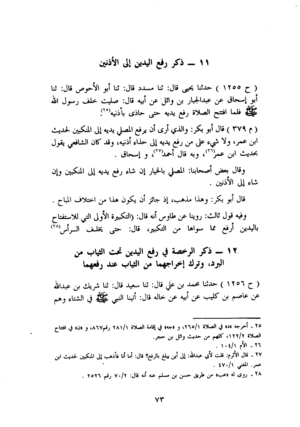 1255 - حَدَّثنا يَحْيَى، قَالَ: ثنا مُسَدَّدٌ، قَالَ: ثنا أَبُو الْأَحْوَصِ، قَالَ: ثنا أَبُو إِسْحَاقَ، عَنْ عَبْدِ الْجَبَّارِ بْنِ وَائِلٍ، عَنْ أَبِيهِ، قَالَ: «صَلَّيْتُ خَلْفَ رَسُولِ اللهِ صَلَّى اللَّهُ عَلَيْهِ وَسَلَّمَ، فَلَمَّا افْتَتَحَ الصَّلَاةَ رَفَعَ يَدَيْهِ حَتَّى حَاذَى بِأُذُنَيْهِ» . قَالَ أَبُو بَكْرٍ: وَالَّذِي أَرَى أَنْ يَرْفَعَ الْمُصَلِّي يَدَيْهِ إِلَى الْمَنْكِبَيْنِ؛ لِحَدِيثِ ابْنِ عُمَرَ، وَلَا شَيْءَ عَلَى مَنْ رَفَعَ يَدَيْهِ إِلَى حِذَاءِ أُذُنَيْهِ، وَقَدْ كَانَ الشَّافِعِيُّ يَقُولُ بِحَدِيثِ ابْنِ عُمَرَ، وَبِهِ قَالَ أَحْمَدُ، وَإِسْحَاقُ. وَقَالَ بَعْضُ أَصْحَابِنَا: الْمُصَلِّي بِالْخِيَارِ إِنْ شَاءَ رَفَعَ يَدَيْهِ إِلَى الْمَنْكِبَيْنِ وَإِنْ شَاءَ إِلَى الْأُذُنَيْنِ. قَالَ أَبُو بَكْرٍ: وَهَذَا مَذْهَبٌ، إِذْ جَائِزٌ أَنْ يَكُونَ هَذَا مِنَ اخْتِلَافِ الْمُبَاحِ. وَفِيهِ قَوْلٌ ثَالِثٌ، رُوِّينَا عَنْ طَاوُسٍ أَنَّهُ قَالَ: التَّكْبِيرَةُ الْأُولَى الَّتِي لِلِاسْتِفْتَاحِ بِالْيَدَيْنِ أَرْفَعُ مِمَّا سِوَاهَا مِنَ التَّكْبِيرِ، قَالَ: حَتَّى يَخْلُفَ الرَّأْسَ