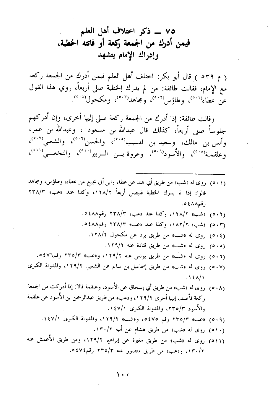 ذِكْرُ اخْتِلَافِ أَهْلِ الْعِلْمِ فِيمَنْ أَدْرَكَ مِنَ الْجُمُعَةِ رَكْعَةً، أَوْ فَاتَتْهُ الْخُطْبَةُ، وَإِدْرَاكِ الْإِمَامِ يَتَشَهَّدُ قَالَ أَبُو بَكْرٍ: اخْتَلَفَ أَهْلُ الْعِلْمِ فِيمَنْ أَدْرَكَ مِنَ الْجُمُعَةِ رَكْعَةً مَعَ الْإِمَامِ، فَقَالَتْ طَائِفَةٌ: مَنْ لَمْ يُدْرِكِ الْخُطْبَةَ صَلَّى أَرْبَعًا، رُوِيَ هَذَا الْقَوْلُ عَنْ عَطَاءٍ، وَطَاوُسٍ، وَمُجَاهِدٍ، وَمَكْحُولٍ. وَقَالَتْ طَائِفَةٌ: إِذَا أَدْرَكَ مِنَ الْجُمُعَةِ رَكْعَةً صَلَّى إِلَيْهَا أُخْرَى، وَإِنْ أَدْرَكَهُمْ جُلُوسًا صَلَّى أَرْبَعًا، كَذَلِكَ قَالَ عَبْدُ اللهِ بْنُ مَسْعُودٍ، وَعَبْدُ اللهِ بْنُ عُمَرَ، وَأَنَسُ بْنُ مَالِكٍ، وَسَعِيدُ بْنُ الْمُسَيِّبِ، وَالْحَسَنُ، وَالشَّعْبِيُّ، وَعَلْقَمَةُ، وَالْأَسْوَدُ، وَعُرْوَةُ بْنُ الزُّبَيْرِ، وَالنَّخْعِيُّ، -[101]- وَالزُّهْرِيُّ