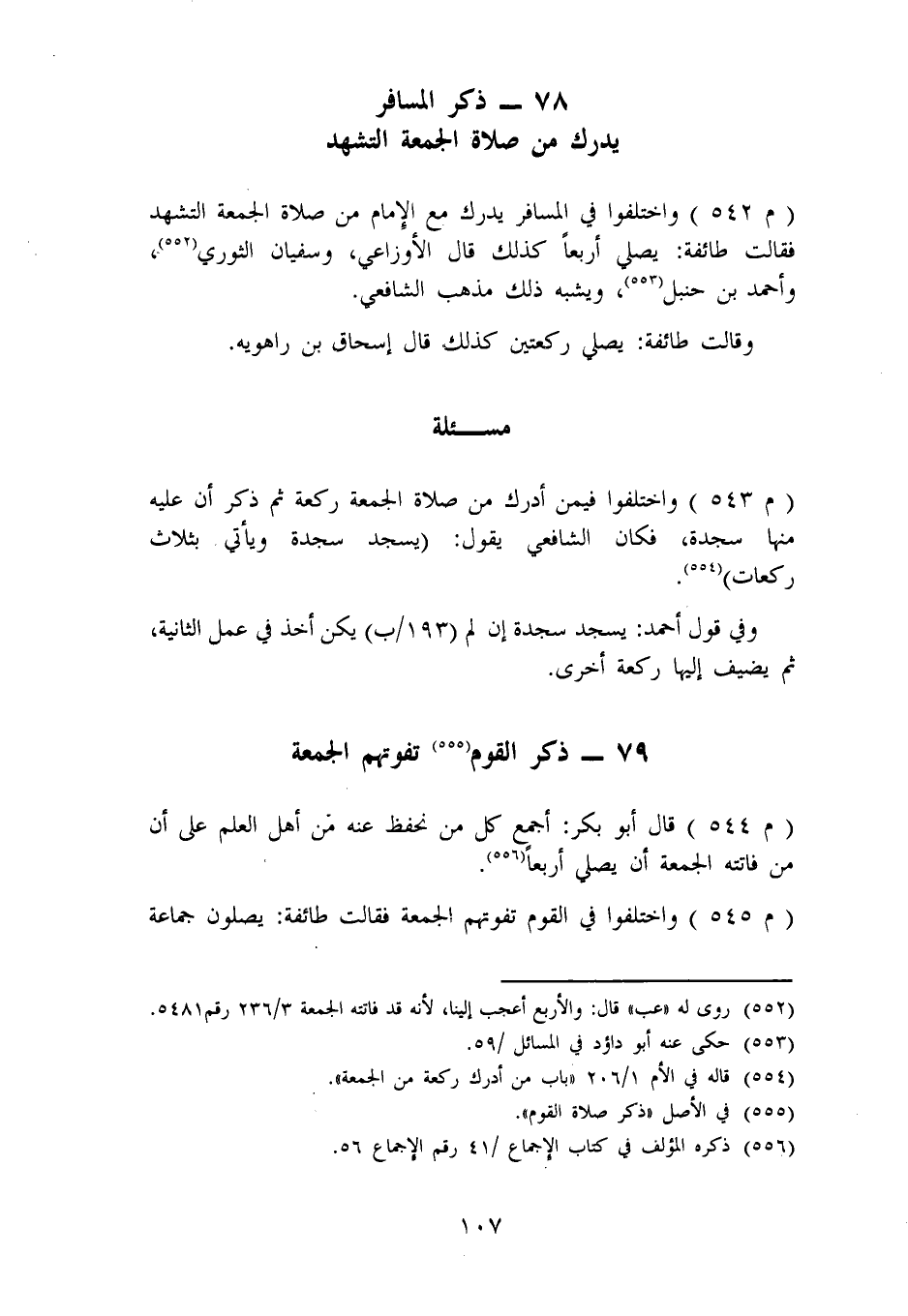 ذِكْرُ الْمُسَافِرِ يُدْرِكُ مِنْ صَلَاةِ الْجُمُعَةِ التَّشَهُّدَ وَاخْتَلَفُوا فِي الْمُسَافِرِ يُدْرِكُ مَعَ الْإِمَامِ مِنْ صَلَاةِ الْجُمُعَةِ التَّشَهُّدَ، فَقَالَتْ طَائِفَةٌ: يُصَلِّي أَرْبَعًا، كَذَلِكَ قَالَ الْأَوْزَاعِيُّ، وَسُفْيَانُ الثَّوْرِيُّ، وَأَحْمَدُ بْنُ حَنْبَلٍ، وَيُشْبِهُ ذَلِكَ مَذْهَبُ الشَّافِعِيِّ. وَقَالَتْ طَائِفَةٌ: يُصَلِّي رَكْعَتَيْنِ، كَذَلِكَ قَالَ إِسْحَاقُ بْنُ رَاهَوَيْهِ.