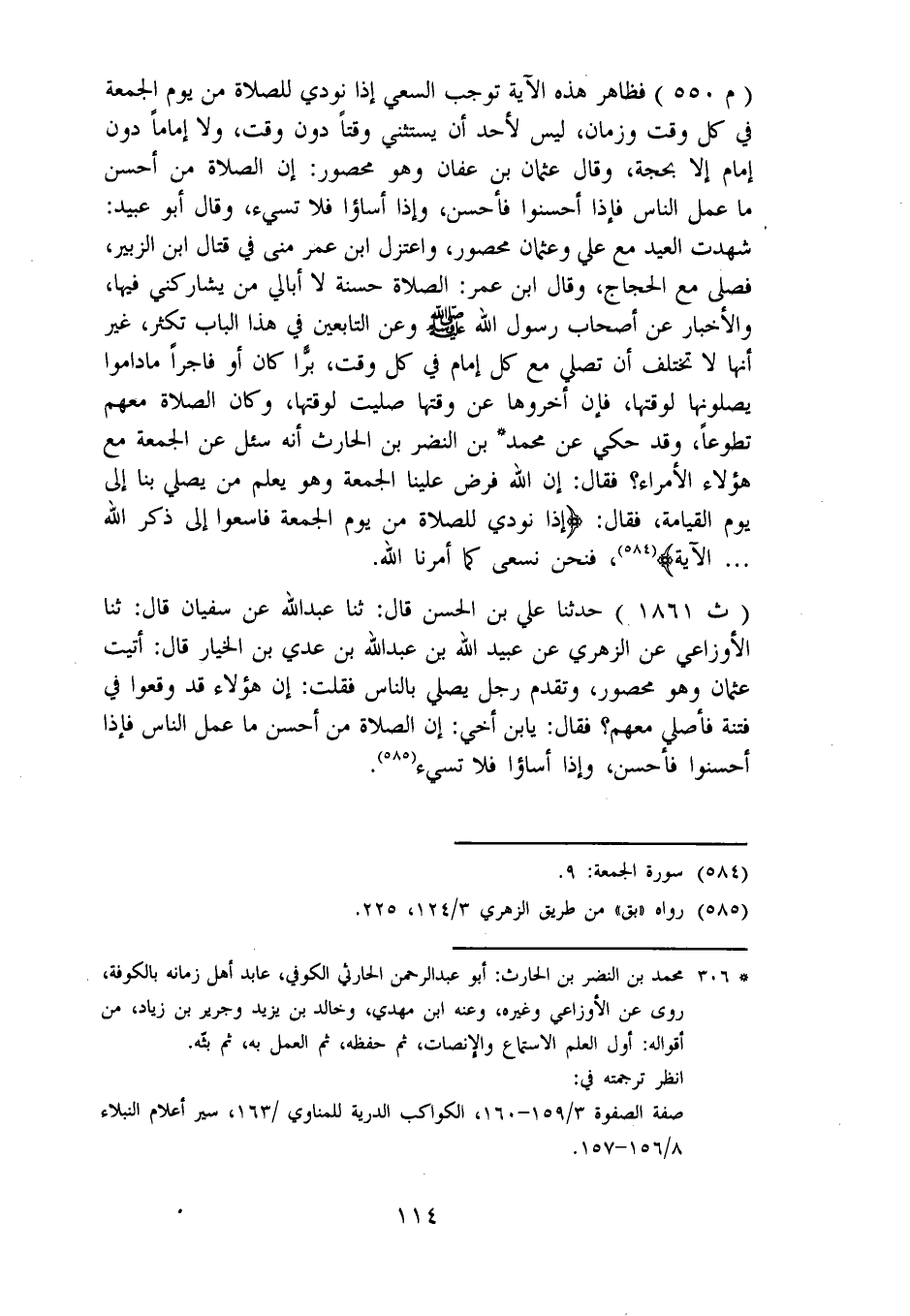 فَظَاهِرُ هَذِهِ الْآيَةِ تُوجِبُ السَّعْيَ إِذَا نُودِيَ لِلصَّلَاةِ مِنْ يَوْمِ الْجُمُعَةِ فِي كُلِّ وَقْتٍ وَزَمَانٍ، لَيْسَ لِأَحَدٍ أَنْ يَسْتَثْنِيَ وَقْتًا دُونَ وَقْتٍ، وَلَا إِمَامًا دُونَ إِمَامٍ إِلَّا بِحُجَّةٍ، وَقَالَ عُثْمَانُ بْنُ عَفَّانَ وَهُوَ مَحْصُورٌ: إِنَّ الصَّلَاةَ مِنْ أَحْسَنِ مَا عَمِلَ النَّاسُ، فَإِذَا أَحْسَنُوا، فَأَحْسِنْ، وَإِذَا أَسَاءُوا، فَلَا تُسِئْ، وَقَالَ أَبُو عُبَيْدٍ: شَهِدْتُ الْعِيدَ مَعَ عَلِيٍّ وَعُثْمَانُ مَحْصُورٌ، وَاعْتَزَلَ ابْنُ عُمَرَ مِنًى فِي قِتَالِ ابْنِ الزُّبَيْرِ فَصَلَّى مَعَ الْحُجَّاجِ، وَقَالَ ابْنُ عُمَرَ: الصَّلَاةُ حَسَنَةٌ لَا أُبَالِي مَنْ يُشَارِكُنِي فِيهَا، وَالْأَخْبَارُ عَنْ أَصْحَابِ رَسُولِ اللهِ صَلَّى اللَّهُ عَلَيْهِ وَسَلَّمَ، وَعَنِ التَّابِعِينَ فِي هَذَا الْبَابِ تَكْثُرُ، غَيْرَ أَنَّهَا لَا تَخْتَلِفُ أَنْ تُصَلِّيَ مَعَ كُلِّ إِمَامٍ فِي كُلِّ وَقْتٍ، بَرًّا كَانَ، أَوْ فَاجِرًا، مَا دَامُوا يُصَلُّونَهَا لِوَقْتِهَا، فَإِنْ أَخَّرُوهَا عَنْ وَقْتِهَا صَلَّيْتَ لِوَقْتِهَا، وَكَانَتِ الصَّلَاةُ مَعَهُمْ تَطَوُّعًا، وَقَدْ حُكِيَ عَنْ مُحَمَّدِ بْنِ النَّضْرِ بْنِ الْحَارِثِ أَنَّهُ سُئِلَ عَنِ الْجُمُعَةِ مَعَ هَؤُلَاءِ الْأُمَرَاءِ، فَقَالَ: إِنَّ اللهَ فَرَضَ عَلَيْنَا الْجُمُعَةَ، وَهُوَ يَعْلَمُ مَنْ يُصَلِّي بِنَا إِلَى يَوْمِ الْقِيَامَةِ، فَقَالَ: {إِذَا نُودِيَ لِلصَّلَاةِ مِنْ يَوْمِ الْجُمُعَةِ، فَاسْعَوْا إِلَى ذِكْرِ اللهِ} [الجمعة: 9] الْآيَةَ، فَنَحْنُ نَسْعَى كَمَا أَمَرَنَا اللهُ