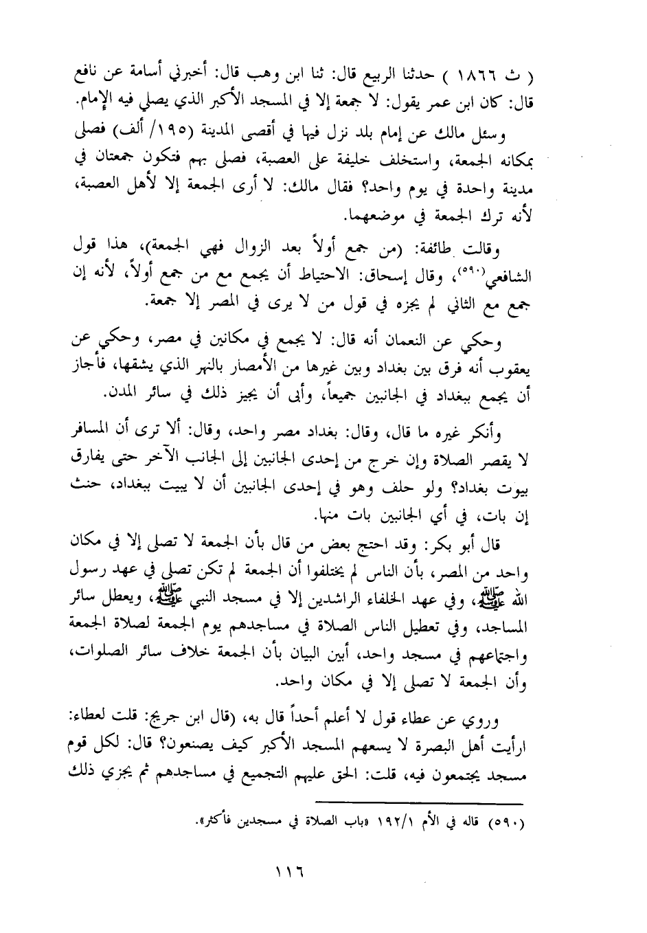 1866 - حَدَّثَنَا الرَّبِيعُ، قَالَ: ثنا ابْنُ وَهْبٍ، قَالَ: أَخْبَرَنِي أُسَامَةُ، عَنْ نَافِعٍ، قَالَ: كَانَ ابْنُ عُمَرَ يَقُولُ: «لَا جُمُعَةَ إِلَّا فِي الْمَسْجِدِ الْأَكْبَرِ الَّذِي يُصَلِّي فِيهِ الْإِمَامُ» وَسُئِلَ مَالِكٍ، عَنْ إِمَامِ بَلَدٍ نَزَلَ فِيهَا فِي أَقْصَى الْمَدِينَةِ، فَصَلَّى بِمَكَانِهِ الْجُمُعَةَ، وَاسْتَخْلَفَ خَلِيفَةً عَلَى الْعَصَبَةِ، فَصَلَّى بِهِمْ، فَتَكُونُ جُمْعَتَانِ فِي مَدِينَةٍ وَاحِدَةٍ فِي يَوْمٍ وَاحِدٍ، فَقَالَ مَالِكٌ: لَا أَرَى الْجُمُعَةَ إِلَّا لِأَهْلِ الْعَصَبَةِ؛ لِأَنَّهُ تَرَكَ الْجُمُعَةَ فِي مَوْضِعِهَا. وَقَالَتْ طَائِفَةٌ: مَنْ جَمَعَ أَوَّلًا بَعْدَ الزَّوَالِ، فَهِيَ الْجُمُعَةُ، هَذَا قَوْلُ الشَّافِعِيِّ، وَقَالَ إِسْحَاقُ: الِاحْتِيَاطُ أَنْ يَجْمَعَ مَعَ مَنْ جَمَعَ أَوَّلًا؛ لِأَنَّهُ إِنْ جَمَعَ مَعَ الثَّانِي لَمْ يُجْزِهِ فِي قَوْلِ مَنْ لَا يَرَى فِي الْمِصْرِ إِلَّا جُمُعَةً. وَحُكِيَ عَنِ النُّعْمَانِ أَنَّهُ قَالَ: لَا يُجَمَّعُ فِي مَكَانَيْنِ فِي مِصْرٍ، وَحُكِيَ عَنْ يَعْقُوبَ أَنَّهُ فَرَّقَ بَيْنَ بَغْدَادَ، وَبَيْنَ غَيْرِهَا مِنَ الْأَمْصَارِ بِالنَّهَرِ الَّذِي يَشُقُّهَا، فَأَجَازَ أَنْ يُجَمَّعَ بِبَغْدَادَ فِي الْجَانِبَيْنِ جَمِيعًا، وَأَبَى أَنْ يُجِيزَ ذَلِكَ فِي سَائِرِ الْمُدُنِ. وَأَنْكَرَ غَيْرُهُ مَا قَالَ، وَقَالَ: بَغْدَادَ مِصْرٌ وَاحِدٌ، وَقَالَ: أَلَا تَرَى أَنَّ الْمُسَافِرَ لَا يَقْصُرُ الصَّلَاةَ وَإِنْ خَرَجَ مِنْ إِحْدَى الْجَانِبَيْنِ إِلَى الْجَانِبِ الْآخَرِ، حَتَّى يُفَارِقَ بُيُوتَ بَغْدَادَ؟، وَلَوْ حَلَفَ وَهُوَ فِي إِحْدَى الْجَانِبَيْنِ أَنْ لَا يَبِيتَ بِبَغْدَادَ حَنِثَ إِنْ بَاتَ فِي أَيِ الْجَانِبَيْنِ بَاتَ مِنْهَا؟ . قَالَ أَبُو بَكْرٍ: وَقَدِ احْتَجَّ بَعْضُ مَنْ قَالَ بِأَنَّ الْجُمُعَةَ لَا تُصَلَّى إِلَّا فِي مَكَانٍ وَاحِدٍ مِنَ الْمِصْرِ؛ لِأَنَّ النَّاسَ لَمْ يَخْتَلِفُوا أَنَّ الْجُمُعَةَ لَمْ تَكُنْ تُصَلَّى فِي عَهْدِ رَسُولِ اللهِ صَلَّى اللَّهُ عَلَيْهِ وَسَلَّمَ، وَفِي عَهْدِ الْخُلَفَاءِ الرَّاشِدِينَ، إِلَّا فِي مَسْجِدِ النَّبِيِِّ صَلَّى اللَّهُ عَلَيْهِ وَسَلَّمَ، وَيُعَطَّلُ سَائِرُ الْمَسَاجِدِ، وَفِي تَعْطِيلِ النَّاسِ الصَّلَاةَ فِي مَسَاجِدِهِمْ يَوْمَ الْجُمُعَةِ لِصَلَاةِ الْجُمُعَةِ، وَاجِتِمَاعِهِمْ فِي مَسْجِدٍ وَاحِدٍ أَبْيَنُ الْبَيَانِ بِأَنَّ الْجُمُعَةَ خِلَافُ سَائِرِ الصَّلَوَاتِ، وَأَنَّ الْجُمُعَةَ لَا تُصَلَّى إِلَّا فِي مَكَانٍ وَاحِدٍ. وَرُوِيَ عَنْ عَطَاءٍ قَوْلٌ لَا أَعْلَمُ أَحَدًا قَالَ بِهِ، قَالَ ابْنُ جُرَيْجٍ: قُلْتُ لِعَطَاءٍ، أَرَأَيْتَ أَهْلَ الْبَصْرَةِ لَا يَسَعُهُمُ الْمَسْجِدُ الْأَكْبَرُ، كَيْفَ يَصْنَعُونَ؟، قَالَ: لِكُلِّ قَوْمٍ مَسْجِدٌ يَجْتَمِعُونَ فِيهِ، قُلْتُ: الْحَقُّ عَلَيْهِمُ التَّجْمِيعُ فِي مَسَاجِدِهِمْ، ثُمَّ يُجْزِي ذَلِكَ -[117]- عَنْهُمْ مِنَ التَّجْمِيعِ فِي الْمَسْجِدِ الْأَكْبَرِ إِذَا لَمْ يُسْعْهُمْ؟ قَالَ: نَعَمْ، قَالَ أَبُو بَكْرٍ: قَوْلُ الشَّافِعِيِّ حَسَنٌ