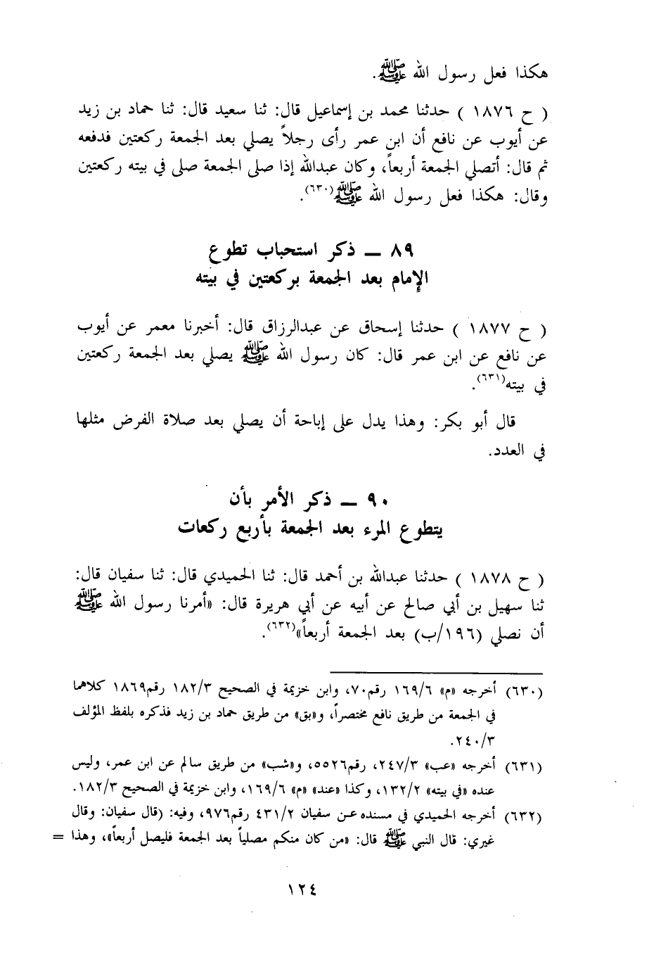 1876 - حَدَّثَنَا مُحَمَّدُ بْنُ إِسْمَاعِيلَ، قَالَ: نا سَعِيدٌ، قَالَ: ثنا حَمَّادُ بْنُ زَيْدٍ، عَنْ أَيُّوبَ، عَنْ نَافِعٍ، أَنَّ ابْنَ عُمَرَ: " رَأَى رَجُلًا يُصَلِّي بَعْدَ الْجُمُعَةِ رَكْعَتَيْنِ فَدَفَعَهُ، ثُمَّ قَالَ: أَتُصَلِّي الْجُمُعَةَ أَرْبَعًا؟، وَكَانَ عَبْدُ اللهِ إِذَا صَلَّى الْجُمُعَةَ صَلَّى فِي بَيْتِهِ رَكْعَتَيْنِ، وَقَالَ: هَكَذَا فَعَلَ رَسُولُ اللهِ صَلَّى اللَّهُ عَلَيْهِ وَسَلَّمَ "