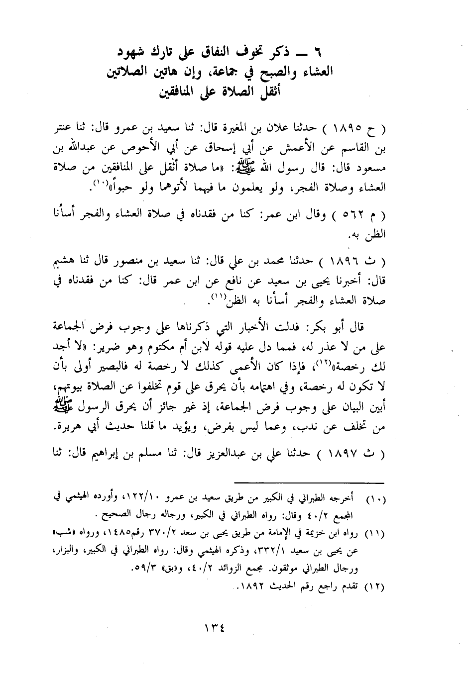 1896 - حَدَّثَنَا مُحَمَّدُ بْنُ عَلِيٍّ، قَالَ: ثنا سَعِيدُ بْنُ مَنْصُورٍ، قَالَ: ثنا هُشَيْمٌ، قَالَ: أَخْبَرَنَا يَحْيَى بْنُ سَعِيدٍ، عَنْ نَافِعٍ، عَنِ ابْنِ عُمَرَ، قَالَ: «كُنَّا مَنْ فَقَدْنَاهُ فِي صَلَاةِ الْعِشَاءِ، وَالْفَجْرِ أَسَأْنَا بِهِ الظَّنَّ» قَالَ أَبُو بَكْرٍ: فَدَلَّتِ الْأَخْبَارُ الَّتِي ذَكَرْنَاهَا عَلَى وُجُوبِ فَرْضِ الْجَمَاعَةِ عَلَى مَنْ لَا عُذْرَ لَهُ، فَمِمَّا دَلَّ عَلَيْهِ قَوْلُهُ لِابْنِ أُمِّ مَكْتُومٍ، وَهُوَ ضَرِيرٌ: «لَا أَجِدُ لَكَ رُخْصَةً» ، فَإِذَا كَانَ الْأَعْمَى كَذَلِكَ، لَا رُخْصَةَ لَهُ، فَالْبَصِيرُ أَوْلَى بِأَنْ لَا تَكُونَ لَهُ رُخْصَةٌ، وَفِي اهْتِمَامِهِ بِأَنْ يُحَرِّقَ عَلَى قَوْمٍ تَخَلَّفُوا عَنِ الصَّلَاةِ بُيُوتَهُمْ أَبْيَنُ الْبَيَانِ عَلَى وُجُوبِ فَرْضِ الْجَمَاعَةِ، إِذْ غَيْرُ جَائِزٍ أَنْ يُحَرِّقَ رَسُولُ اللهِ صَلَّى اللَّهُ عَلَيْهِ وَسَلَّمَ مَنْ تَخَلَّفَ عَلَى نَدْبٍ، وَعَمَّا لَيْسَ بِفَرْضٍ، وَيُؤَيِّدُ مَا قُلْنَا حَدِيثُ أَبِي هُرَيْرَةَ