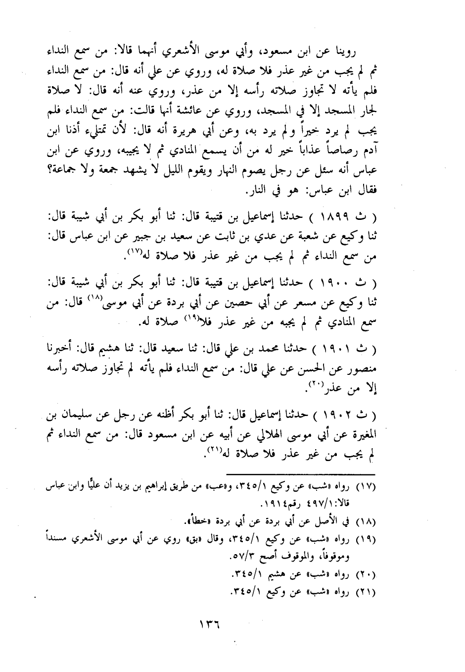 1899 - حَدَّثَنَا إِسْمَاعِيلُ بْنُ قُتَيْبَةَ، قَالَ: ثنا أَبُو بَكْرِ بْنُ أَبِي شَيْبَةَ، قَالَ: ثنا وَكِيعٌ، عَنْ شُعْبَةَ، عَنْ عَدِيِّ بْنِ ثَابِتٍ، عَنْ سَعِيدِ بْنِ جُبَيْرٍ، عَنِ ابْنِ عَبَّاسٍ، قَالَ: «مَنْ سَمِعَ النِّدَاءَ، ثُمَّ لَمْ يُجِبْ مِنْ غَيْرِ عُذْرٍ فَلَا صَلَاةَ لَهُ»