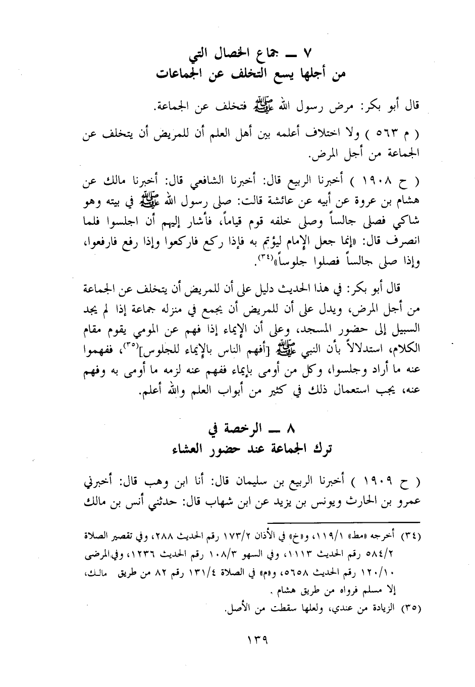 1908 - أَخْبَرَنَا الرَّبِيعُ، قَالَ: أَخْبَرَنَا الشَّافِعِيُّ، قَالَ: أَخْبَرَنَا مَالِكٌ، عَنْ هِشَامِ بْنِ عُرْوَةَ، عَنْ أَبِيهِ، عَنْ عَائِشَةَ، قَالَتْ: صَلَّى رَسُولُ اللهِ صَلَّى اللَّهُ عَلَيْهِ وَسَلَّمَ فِي بَيْتِهِ، وَهُوَ شَاكٍ، فَصَلَّى جَالِسًا، وَصَلَّى خَلْفَهُ قَوْمٌ قِيَامًا، فَأَشَارَ إِلَيْهِمْ أَنِ اجْلِسُوا، فَلَمَّا انْصَرَفَ، قَالَ: «إِنَّمَا جُعِلَ الْإِمَامُ لِيُؤْتَمَّ بِهِ، فَإِذَا رَكَعَ، فَارْكَعُوا، وَإِذَا رَفَعَ، فَارْفَعُوا، وَإِذَا صَلَّى جَالِسًا، فَصَلُّوا جُلُوسًا» قَالَ أَبُو بَكْرٍ: فِي هَذَا الْحَدِيثِ دَلِيلٌ عَلَى أَنَّ لِلْمَرِيضِ أَنْ يَتَخَلَّفَ عَنِ الْجَمَاعَةِ مِنْ أَجْلِ الْمَرَضِ، وَيَدُلُّ عَلَى أَنَّ لِلْمَرِيضِ أَنْ يَجْمَعَ فِي مَنْزِلِهِ جَمَاعَةً إِذَا لَمْ يَجِدِ السَّبِيلَ إِلَى حُضُورِ الْمَسْجِدِ، وَعَلَى أَنَّ الْإِيمَاءَ إِذَا فُهِمَ عَنِ الْمُوِمِئِ يَقُومُ مَقَامَ الْكَلَامِ، اسْتِدْلَالًا بِأَنَّ النَّبِيَّ صَلَّى اللَّهُ عَلَيْهِ وَسَلَّمَ أَفْهَمَ النَّاسَ بِالْإِيمَاءِ لِلْجُلُوسِ، فَفَهِمُوا عَنْهُ مَا أَرَادَ، وَجَلَسُوا، وَكُلُّ مَنْ أَوْمَى بِإِيمَاءٍ فَفُهِمَ عَنْهُ لَزِمَهُ مَا أَوْمَى بِهِ، وَفُهِمَ عَنْهُ، وَيَجِبُ اسْتِعْمَالُ ذَلِكَ فِي كَثِيرٍ مِنْ أَبْوَابِ الْعِلْمِ، وَاللهُ أَعْلَمُ
