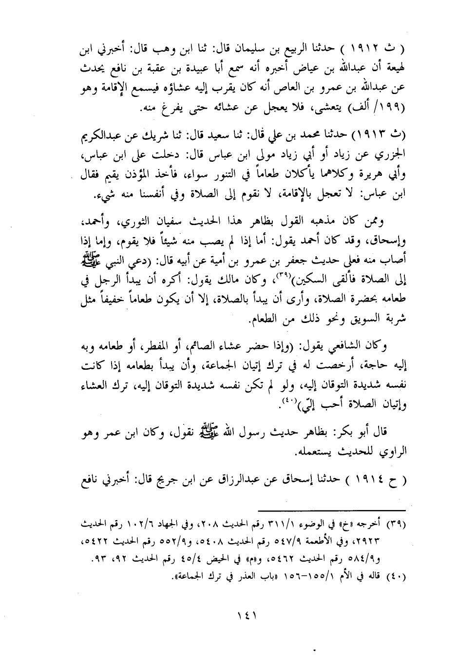 1913 - حَدَّثَنَا مُحَمَّدُ بْنُ عَلِيٍّ، قَالَ: ثنا سَعِيدٌ، قَالَ: ثنا شَرِيكٌ، عَنْ عَبْدِ الْكَرِيمِ الْجَزَرِيِّ، عَنْ زِيَادٍ، أَوْ أَبِي زِيَادٍ مَوْلَى ابْنِ عَبَّاسٍ، قَالَ: دَخَلْتُ عَلَى ابْنِ عَبَّاسٍ، وَأَبِي هُرَيْرَةَ، وَكِلَاهُمَا يَأْكُلَانِ طَعَامًا فِي التَّنُّورِ سَوَاءً، فَأَخَذَ الْمُؤَذِّنُ يُقِيمُ، فَقَالَ ابْنُ عَبَّاسٍ: لَا تُعَجِّلْ بِالْإِقَامَةِ، لَا نَقُومُ إِلَى الصَّلَاةِ، وَفِي أَنْفُسِنَا مِنْهُ شَيْءٌ. وَمِمَّنْ كَانَ مَذْهَبُهُ الْقَوْلَ بِظَاهِرِ هَذَا الْحَدِيثِ: سُفْيَانُ الثَّوْرِيُّ، وَأَحْمَدُ، وَإِسْحَاقُ، وَقَدْ كَانَ أَحْمَدُ يَقُولُ: أَمَّا إِذَا لَمْ يُصِبْ مِنْهُ شَيْئًا، فَلَا يَقُومُ، وَإِمَّا إِذَا أَصَابَ مِنْهُ، فَعَلَى حَدِيثِ جَعْفَرِ بْنِ عَمْرِو بْنِ أُمَيَّةَ، عَنْ أَبِيهِ، قَالَ: دُعِيَ النَّبِيُّ صَلَّى اللَّهُ عَلَيْهِ وَسَلَّمَ إِلَى الصَّلَاةِ، فَأَلْقَى السِّكِّينَ. وَكَانَ مَالِكٌ يَقُولُ: أَكْرَهُ أَنْ يَبْدَأَ الرَّجُلُ فِي طَعَامِهِ بِحَضْرَةِ الصَّلَاةِ، وَأَرَى أَنْ يَبْدَأَ بِالصَّلَاةِ، إِلَّا أَنْ يَكُونَ طَعَامًا خَفِيفًا مِثْلَ شُرْبَةِ السَّوِيقِ، وَنَحْوِ ذَلِكَ مِنَ الطَّعَامِ. وَكَانَ الشَّافِعِيُّ يَقُولُ: وَإِذَا حَضَرَ عَشَاءُ الصَّائِمِ، أَوِ الْمُفْطِرِ، أَوْ طَعَامُهُ، وَبِهِ إِلَيْهِ حَاجَةٌ، أَرْخَصْتُ لَهُ فِي تَرْكِ إِتْيَانِ الْجَمَاعَةِ، وَأَنْ يَبْدَأَ بِطَعَامِهِ إِذَا كَانَتْ نَفْسُهُ شَدِيدَةَ التَّوَقَانِ إِلَيْهِ، وَلَوْ لَمْ تَكُنْ نَفْسُهُ شَدِيدَةَ التَّوَقَانِ إِلَيْهِ تَرَكَ الْعَشَاءَ، وَإِتْيَانُ الصَّلَاةِ أَحَبُّ إِلَيَّ. قَالَ أَبُو بَكْرٍ: بِظَاهِرِ حَدِيثِ رَسُولِ اللهِ صَلَّى اللَّهُ عَلَيْهِ وَسَلَّمَ نَقُولُ، وَكَانَ ابْنُ عُمَرَ، وَهُوَ الرَّاوِي لِلْحَدِيثِ يَسْتَعْمِلُهُ