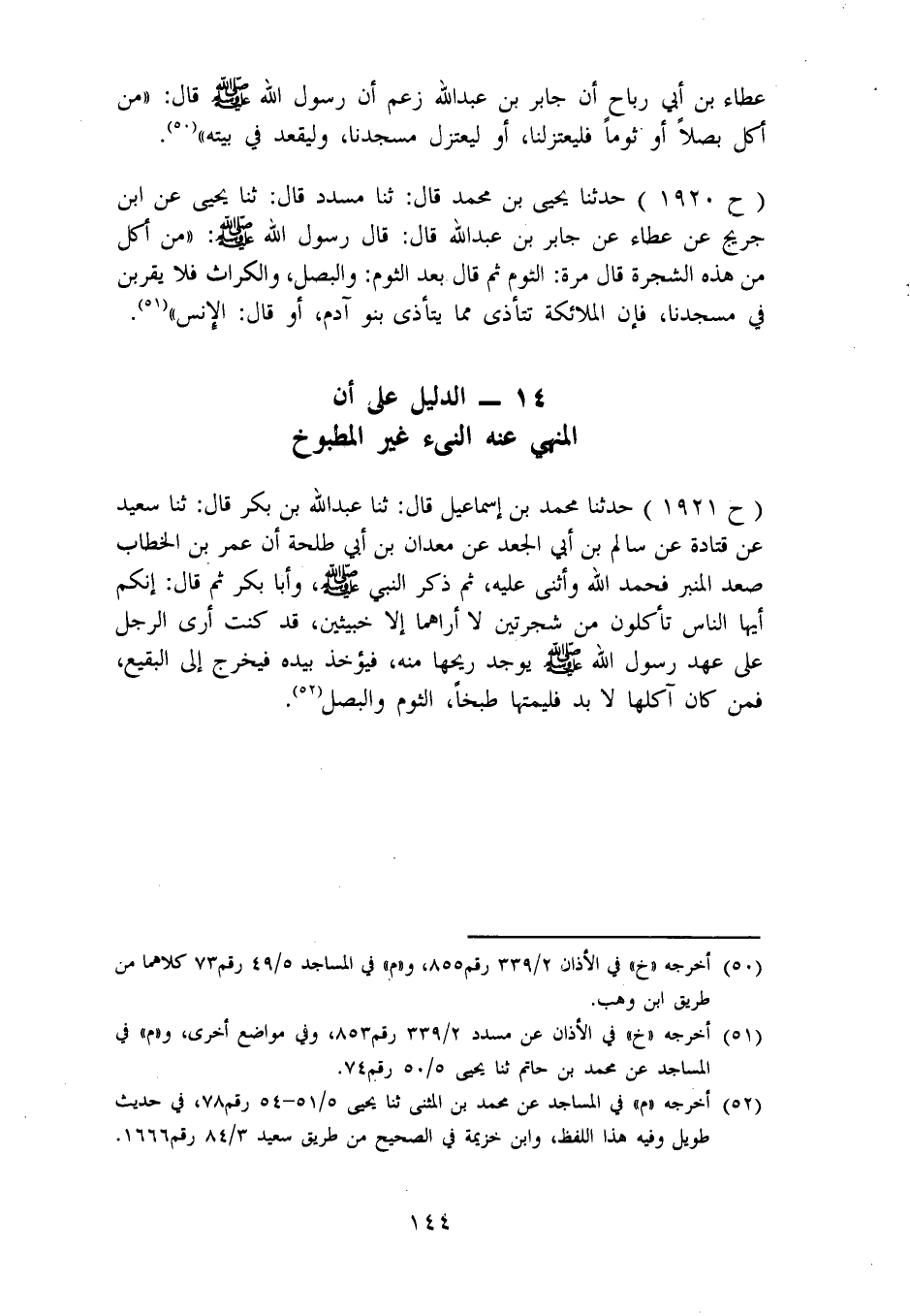 1920 - حَدَّثَنَا يَحْيَى بْنُ مُحَمَّدٍ، قَالَ: ثنا مُسَدَّدٌ، قَالَ: ثنا يَحْيَى، عَنِ ابْنِ جُرَيْجٍ، عَنْ عَطَاءٍ، عَنْ جَابِرِ بْنِ عَبْدِ اللهِ، قَالَ: قَالَ رَسُولُ اللهِ صَلَّى اللَّهُ عَلَيْهِ وَسَلَّمَ: " مَنْ أَكَلَ مِنْ هَذِهِ الشَّجَرَةِ، قَالَ مَرَّةً: الثُّومِ، ثُمَّ قَالَ بَعْدُ الثُّومِ، وَالْبَصَلِ، وَالْكُرَّاثِ، فَلَا يَقْرَبَنَّ فِي مَسْجِدِنَا، فَإِنَّ الْمَلَائِكَةَ تَتَأَذَّى مِمَّا يَتَأَذَّى بَنُو آدَمَ أَوْ قَالَ: الْإِنْسُ "
