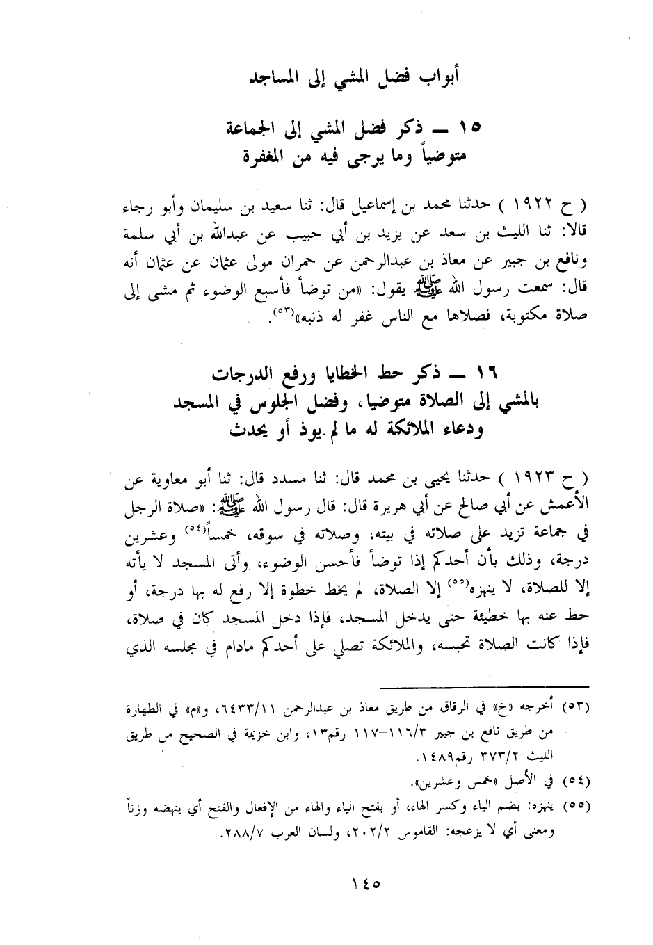 1922 - حَدَّثَنَا مُحَمَّدُ بْنُ إِسْمَاعِيلَ، قَالَ: ثنا سَعِيدُ بْنُ سُلَيْمَانَ، وَأَبُو رَجَاءٍ، قَالَا: ثنا اللَّيْثُ بْنُ سَعْدٍ، عَنْ يَزِيدَ بْنِ أَبِي حَبِيبٍ، عَنْ عَبْدِ اللهِ بْنِ أَبِي سَلَمَةَ، وَنَافِعِ بْنِ جُبَيْرٍ، عَنْ مُعَاذِ بْنِ عَبْدِ الرَّحْمَنِ، عَنْ حُمْرَانَ مَوْلَى عُثْمَانَ، عَنْ عُثْمَانَ، أَنَّهُ قَالَ: سَمِعْتُ رَسُولَ اللهِ صَلَّى اللَّهُ عَلَيْهِ وَسَلَّمَ يَقُولُ: «مَنْ تَوَضَّأَ، فَأَسْبَغَ الْوُضُوءَ، ثُمَّ مَشَى إِلَى صَلَاةِ مَكْتُوبَةٍ فَصَلَّاهَا مَعَ النَّاسِ، غُفِرَ لَهُ ذَنْبُهُ»