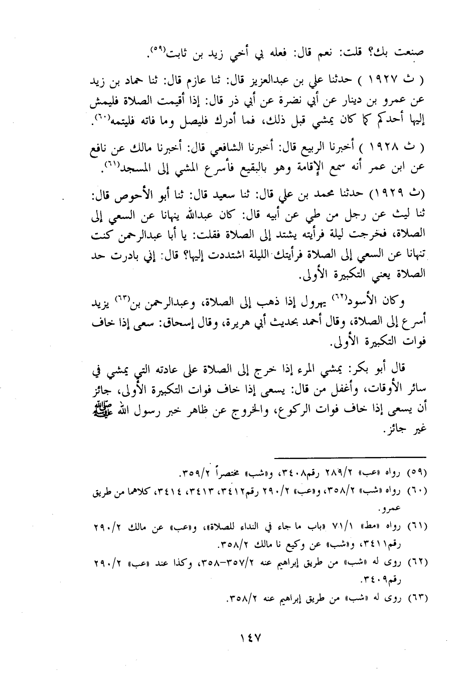 1929 - حَدَّثَنَا مُحَمَّدُ بْنُ عَلِيٍّ، قَالَ: ثنا سَعِيدٌ، قَالَ: ثنا أَبُو الْأَحْوَصِ، قَالَ: ثنا لَيْثٌ، عَنْ رَجُلٍ، مِنْ طَيِّئٍ، عَنْ أَبِيهِ، قَالَ: كَانَ عَبْدُ اللهِ يَنْهَانَا عَنِ السَّعْيِ إِلَى الصَّلَاةِ، فَخَرَجْتُ لَيْلَةً، فَرَأَيْتُهُ يَشْتَدُّ إِلَى الصَّلَاةِ، فَقُلْتُ: يَا أَبَا عَبْدِ الرَّحْمَنِ، كُنْتَ تَنْهَانَا عَنِ السَّعْيِ إِلَى الصَّلَاةِ، فَرَأَيْتُكَ اللَّيْلَةَ اشْتَدَدْتَ إِلَيْهَا؟ قَالَ: إِنِّي بَادَرْتُ حَدَّ الصَّلَاةِ. يَعْنِي التَّكْبِيرَةَ الْأُولَى وَكَانَ الْأَسْوَدُ يُهَرْوِلُ إِذَا ذَهَبَ إِلَى الصَّلَاةِ، وَعَبْدُ الرَّحْمَنِ بْنُ يَزِيدَ أَسْرَعَ إِلَى الصَّلَاةِ، وَقَالَ أَحْمَدُ بِحَدِيثِ أَبِي هُرَيْرَةَ، وَقَالَ إِسْحَاقُ: سَعَى إِذَا خَافَ فَوَاتَ التَّكْبِيرَةِ الْأُولَى. قَالَ أَبُو بَكْرٍ: يَمْشِي الْمَرْءُ إِذَا خَرَجَ إِلَى الصَّلَاةِ عَلَى عَادَتِهِ الَّتِي يَمْشِي فِي سَائِرِ الْأَوْقَاتِ، وَأَغْفَلَ مَنْ قَالَ: يَسْعَى إِذَا خَافَ فَوَاتَ التَّكْبِيرَةِ الْأُولَى، جَائِزٌ أَنْ يَسْعَى إِذَا خَافَ فَوَاتَ الرُّكُوعِ، وَالْخُرُوجُ عَنْ ظَاهِرِ خَبَرِ رَسُولِ اللهِ صَلَّى اللَّهُ عَلَيْهِ وَسَلَّمَ غَيْرُ جَائِزٍ