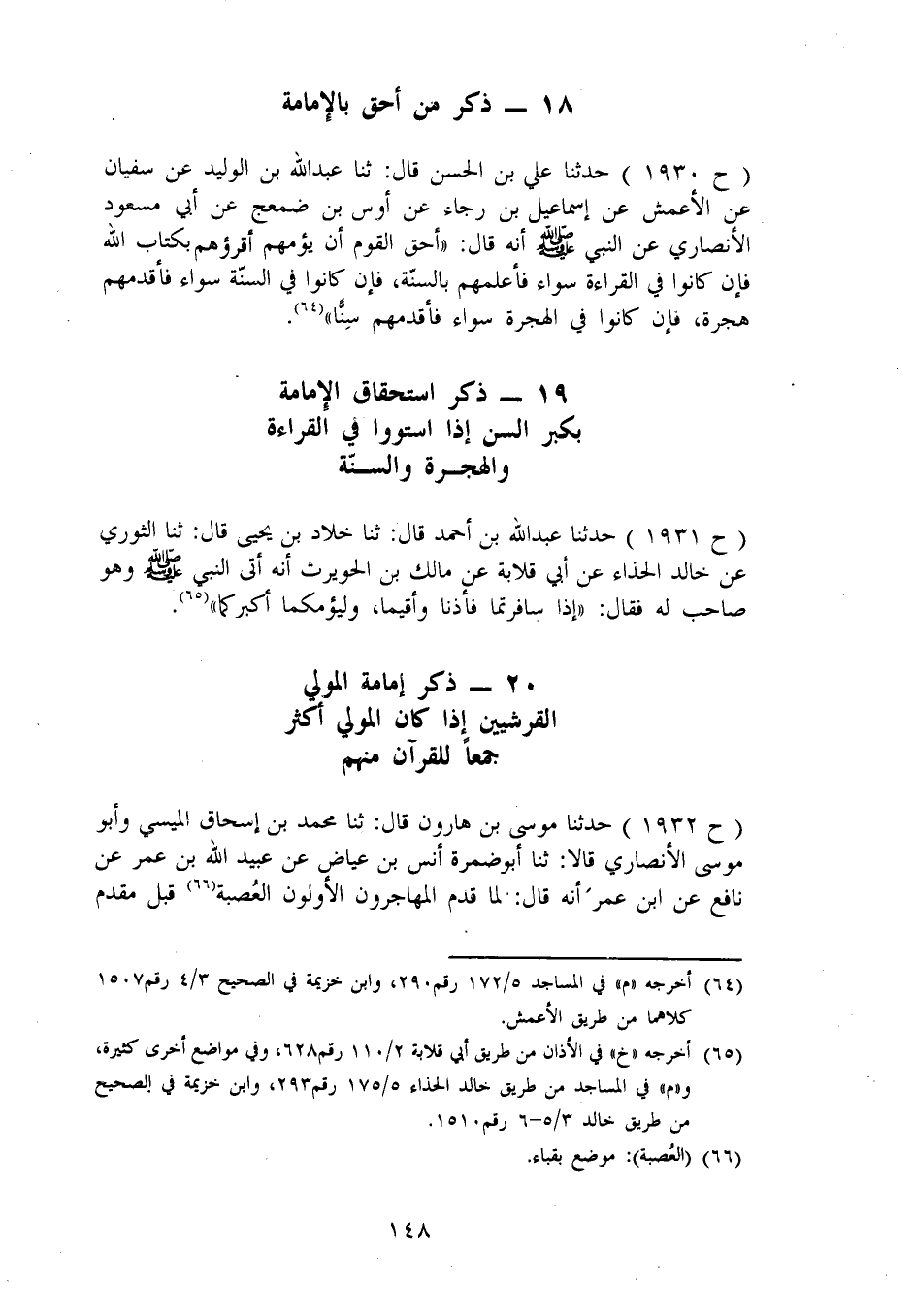 1930 - حَدَّثَنَا عَلِيُّ بْنُ الْحَسَنِ، قَالَ: ثنا عَبْدُ اللهِ بْنُ الْوَلِيدِ، عَنْ سُفْيَانَ، عَنِ الْأَعْمَشِ، عَنْ إِسْمَاعِيلَ بْنِ رَجَاءٍ، عَنْ أَوْسِ بْنِ ضَمْعَجٍ، عَنْ أَبِي مَسْعُودٍ الْأَنْصَارِيِّ، عَنْ النَّبِيِّ صَلَّى اللَّهُ عَلَيْهِ وَسَلَّمَ أَنَّهُ قَالَ: «أَحَقُّ الْقَوْمِ أَنْ يَؤُمَّهُمْ أَقْرَؤُهُمْ بِكِتَابِ اللهِ، فَإِنْ كَانُوا فِي الْقِرَاءَةِ سَوَاءً، فَأَعْلَمُهُمْ بِالسُّنَّةِ، فَإِنْ كَانُوا فِي السُّنَّةِ سَوَاءً، فَأَقْدَمُهُمْ هِجْرَةً، فَإِنْ كَانَ فِي الْهِجْرَةِ سَوَاءً، فَأَقْدَمُهُمْ سِنًّا»