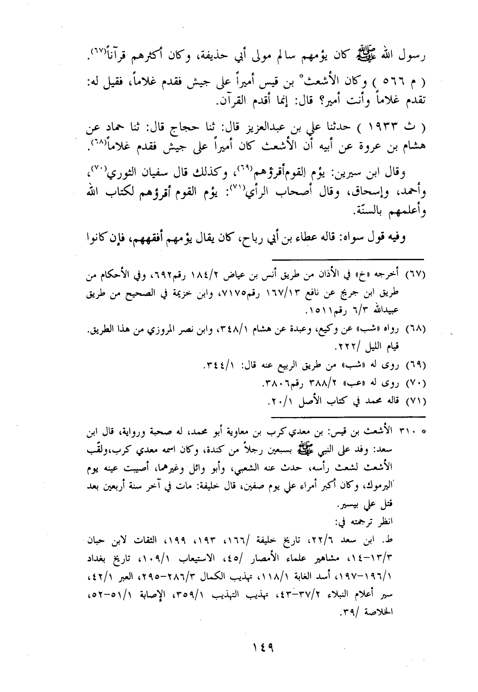 1933 - حَدَّثَنَا عَلِيُّ بْنُ عَبْدِ الْعَزِيزِ، قَالَ: ثنا حَجَّاجٌ، قَالَ: ثنا حَمَّادٌ، عَنْ هِشَامِ بْنِ عُرْوَةَ، عَنْ أَبِيهِ، أَنَّ الْأَشْعَثَ، كَانَ أَمِيرًا عَلَى جَيْشٍ، فَقَدَّمَ غُلَامًا وَقَالَ ابْنُ سِيرِينَ: يَؤُمُّ الْقَوْمَ أَقْرَؤُهُمْ، وَكَذَلِكَ قَالَ سُفْيَانُ الثَّوْرِيُّ، وَأَحْمَدُ، وَإِسْحَاقُ. وَقَالَ أَصْحَابُ الرَّأْيِ: يَؤُمُّ الْقَوْمَ أَقْرَؤُهُمْ لِكِتَابِ اللهِ، وَأَعْلَمُهُمْ بِالسُّنَّةِ وَفِيهِ قَوْلٌ سِوَاهُ، قَالَهُ عَطَاءُ بْنُ أَبِي رَبَاحٍ، كَانَ يُقَالُ: يَؤُمُّهُمْ أَفْقَهُهُمْ، فَإِنْ كَانُوا -[150]- فِي الْفِقْهِ سَوَاءٌ فَأَقْرَؤُهُمْ، فَإِنْ كَانَ فِي الْفِقْهِ وَالْقِرَاءَةِ سَوَاءٌ فَأَسَنُّهُمْ. وَقَالَ مَالِكٌ: يَتَقَدَّمُ الْقَوْمَ أَعْلَمُهُمْ، إِذَا كَانَتْ حَالَتُهُ حَسَنَةٌ؛ وَإِنَّ لِلسِّنِّ لَحَقًّا. قُلْتُ لَهُ: فَأَقْرَؤُهُمْ؟ قَالَ: قَدْ يَقْرَأُ مَنْ لَا يُرِيدُ. أَيْ مَنْ لَا يَرْضَى. وَقَالَ الْأَوْزَاعِيُّ: يَؤُمُّهُمْ أَفْقَهُهُمْ. وَقَالَ الشَّافِعِيُّ: نَأْمُرُ الْقَوْمَ إِذَا اجْتَمَعُوا أَنْ يُقَدِّمُوا أَفْقَهَهُمْ وَأَقْرَأَهُمْ وَأَسَنَّهُمْ، فَإِنْ لَمْ يَجْتَمِعْ ذَلِكَ فِي وَاحِدٍ فَإِنْ قَدَّمُوا أَفْقَهَهُمْ إِذَا كَانَ يَقْرَأُ مِنَ الْقُرْآنِ مَا يَكْتَفِي فِي الصَّلَاةِ فَحَسَنٌ، وَإِنْ قَدَّمُوا أَقْرَأَهُمْ إِذَا كَانَ يَعْلَمُ مِنَ الْفِقْهِ مَا يَلْزَمُهُ فِي الصَّلَاةِ فَحَسَنٌ. وَقَالَ أَبُو ثَوْرٍ: يَؤُمُّهُمْ أَفْقَهُهُمْ إِذَا كَانَ يَقْرَأُ الْقُرْآنَ، وَإِنْ لَمْ يَكُنْ يَقْرَؤُهُ كُلَّهُ. قَالَ أَبُو بَكْرٍ: الْقَوْلُ بِظَاهِرِ خَبَرِ ابْنِ مَسْعُودٍ يَجِبُ؛ فَيُقَدِّمُ النَّاسُ عَلَى سَبِيلِ مَا قَدَّمَهُمْ رَسُولُ اللهِ صَلَّى اللَّهُ عَلَيْهِ وَسَلَّمَ، لَا يُجَاوِزُ ذَلِكَ، وَلَوْ قُدِّمَ إِمَامٌ غَيْرُ هَذَا الْمِثَالِ، كَانَتِ الصَّلَاةُ مُجْزِيَةً، وَيُكْرَهُ خِلَافُ السُّنَّةِ